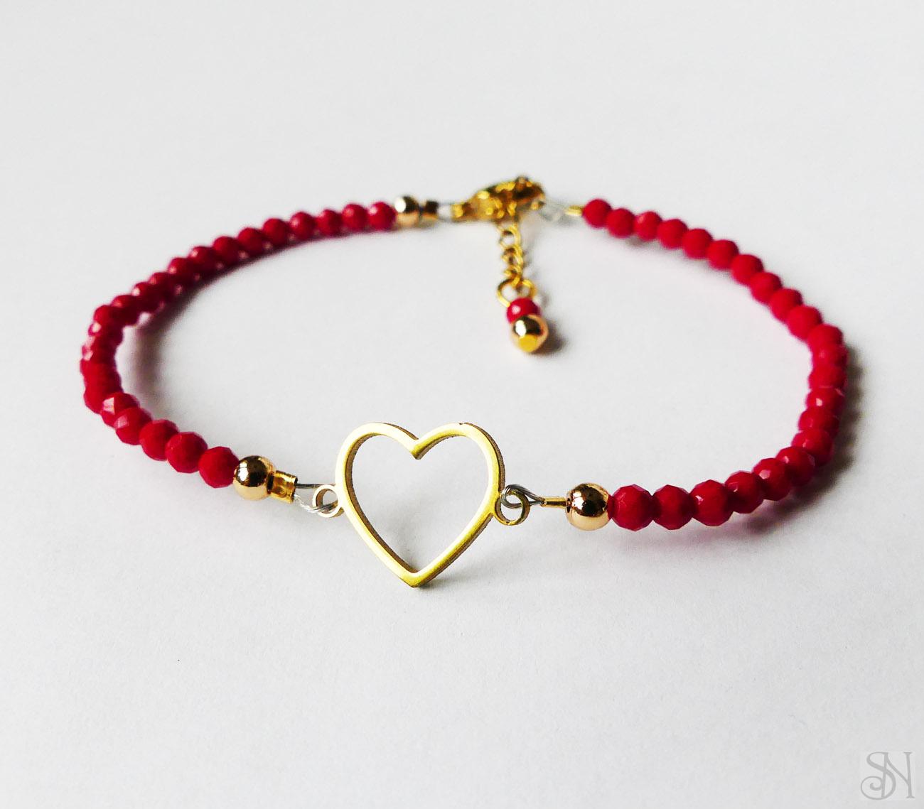 Červený srdiečkový náramok s minerálom koralom. Kovové komponenty sú z chirurgickej ocele, preto je vhodný aj pre alergikov.