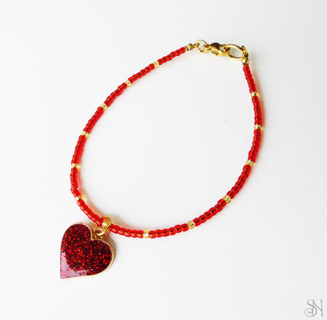 Červený náramok s príveskom srdca doplnený sklenenými korálkami. Dopĺňa ho zapínanie z chirurgickej ocele, prívesok je bižutérny.