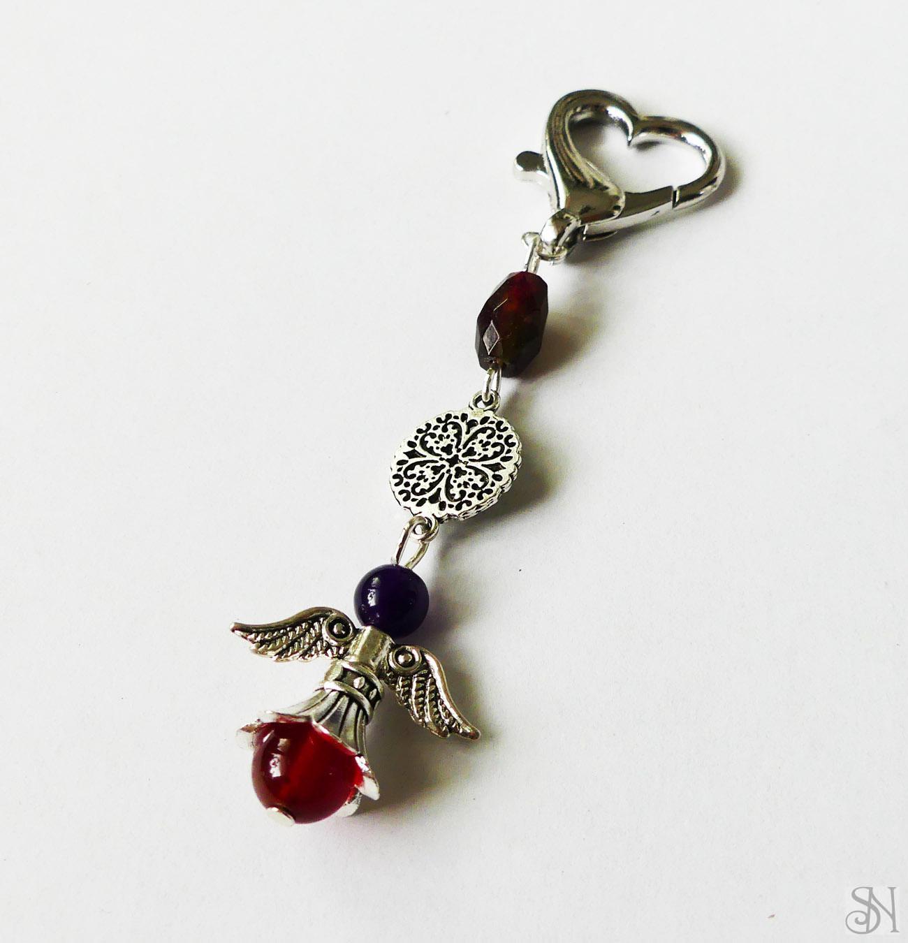 Kľúčenka na karabínku s motívom anjela z bižutérneho kovu s liečivými kameňmi ametystom a karneolom. Veľkosť: 9 cm