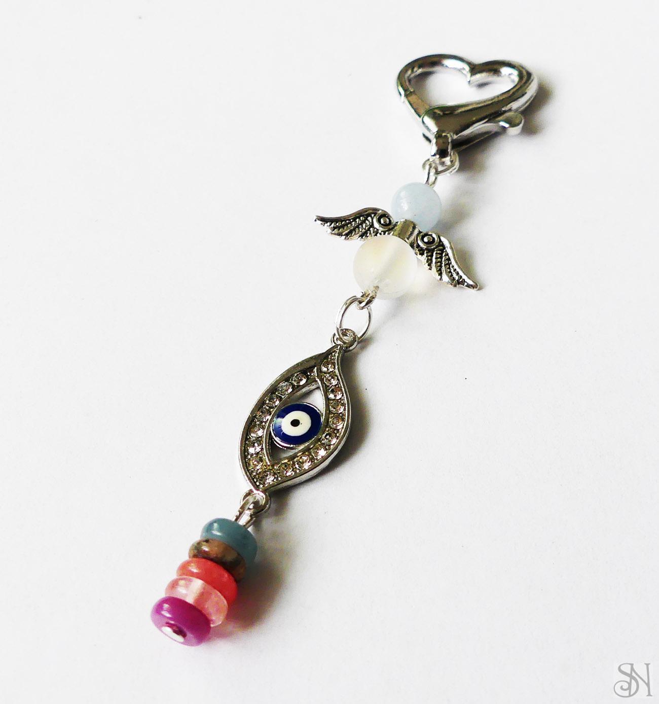 Kľúčenka na karabínku s motívom anjela z bižutérneho kovu s liečivými kameňmi akvamarínom a opalitom. Veľkosť: 10 cm