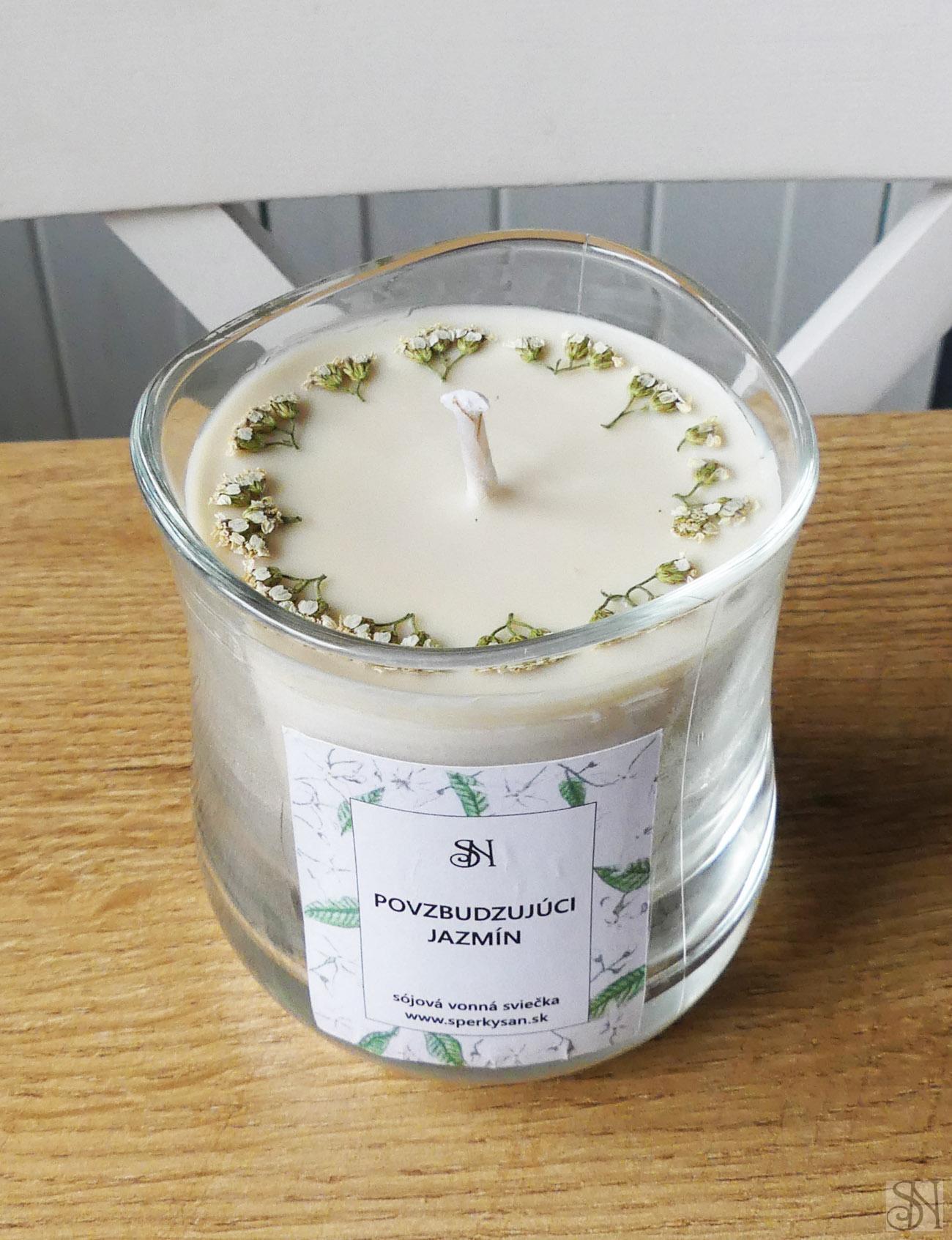 Sójová sviečka s vôňou jazmínu v sklenenej nádobe. Sójové sviečky sú vegánske, šetrné k životnému prostrediu, keďže sú prírodné a horia 2 krát dlhšie než parafínové sviečky. Najväčšou výhodou sójového vosku je, že je netoxický, neuvoľňuje pri horení škodlivé látky ani karcinogény a je vhodný aj pre alergikov. Veľkosť: Sviečka obsahuje cca 160 g vosku