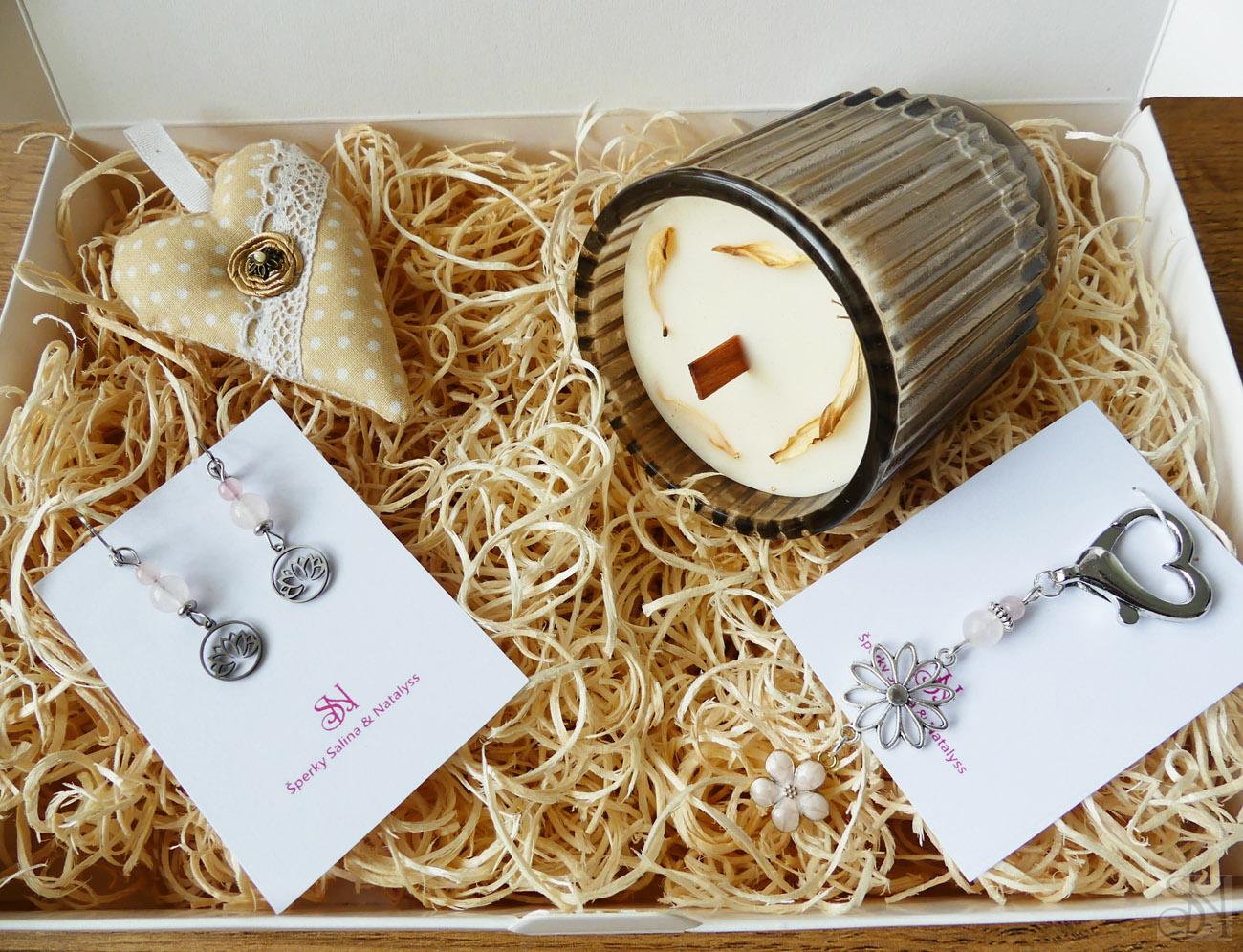 Handmade darčekový box s náušnicami, sviečkou, kľúčenkou a dekoráciou