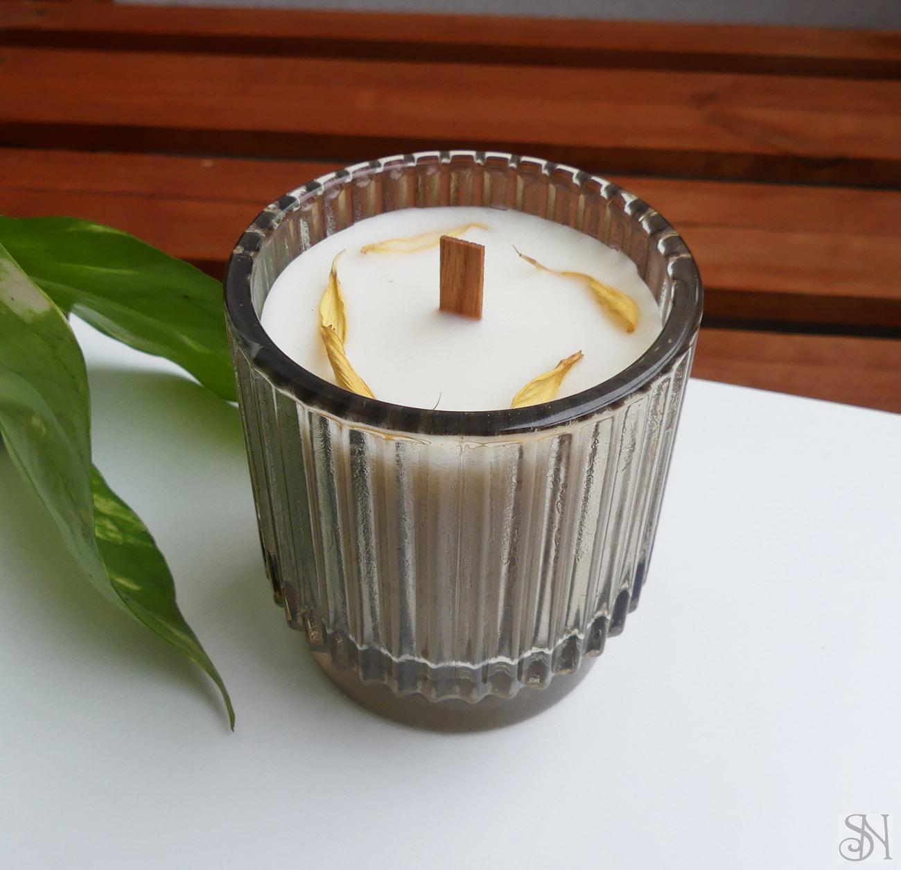 Sójová sviečka s vôňou jazmínu v sklenenej nádobe. Použitý je vonný olej a kvalitný sójový vosk, dekorovaná je lupeňmi kvetov. Sójové sviečky sú vegánske, šetrné k životnému prostrediu, keďže sú prírodné a horia 2 krát dlhšie než parafínové sviečky. Najväčšou výhodou sójového vosku je, že je netoxický, neuvoľňuje pri horení škodlivé látky ani karcinogény a je vhodný aj pre alergikov. Sviečka obsahuje cca 140 g vosku, váha samotnej sklenenej nádoby bez vosku je 219 g.