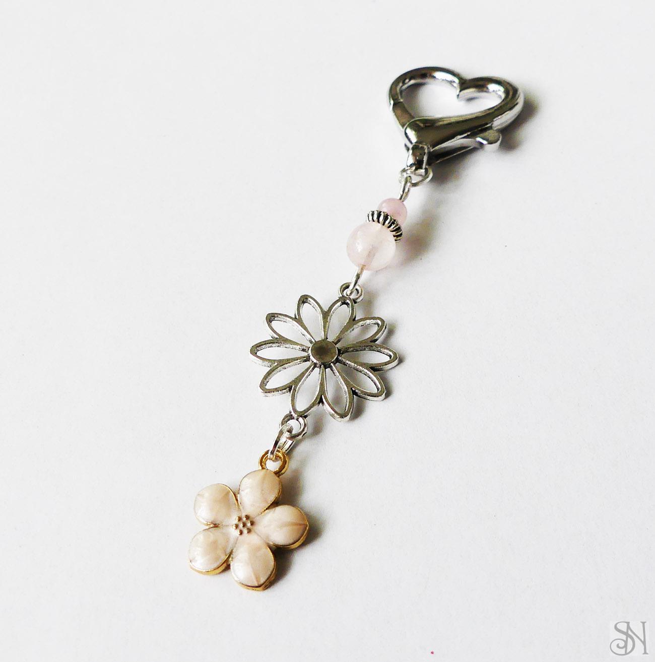 Kľúčenka na karabínku s motívom kvetu z bižutérneho kovu s liečivým kameňom ruženínom. Veľkosť: 9 cm