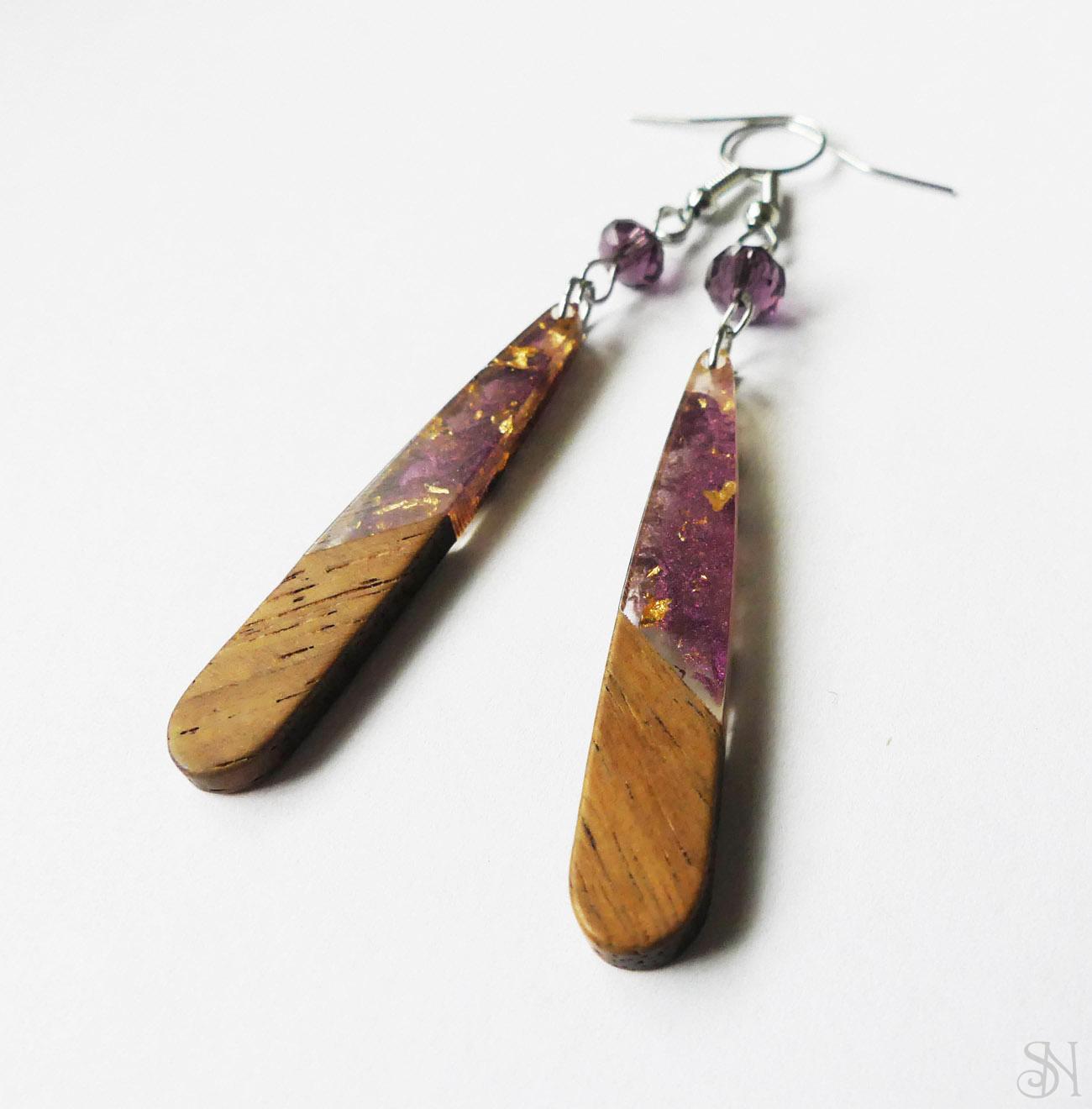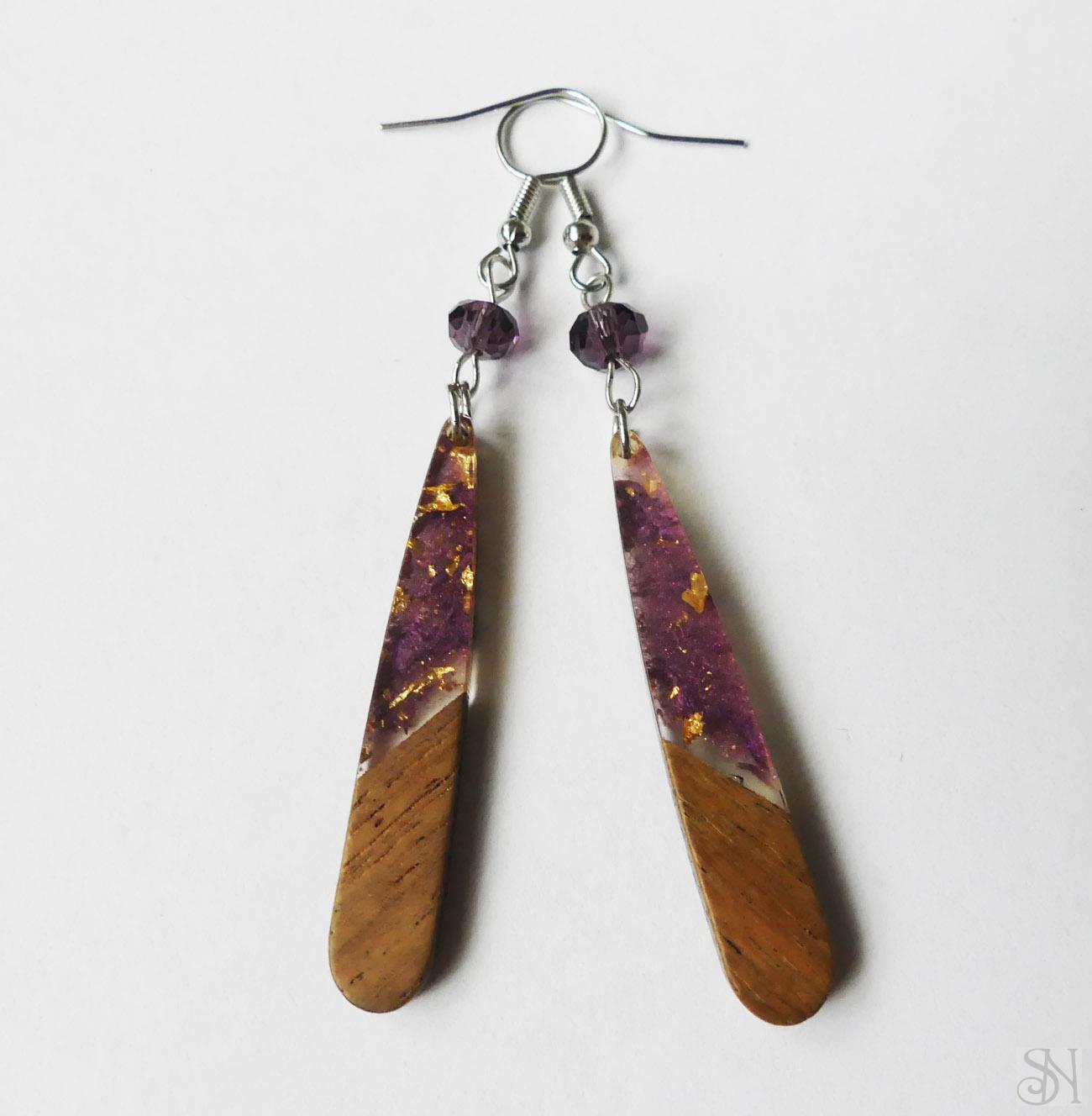 Handmade fialové náušnice z dreva a živice - chirurgická oceľ