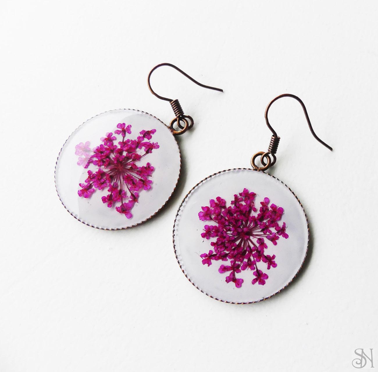 Originálne handmade náušnice s ružovým kvetom v kovovom lôžku medenej farby. Je ručne odlievaný zo živice. Náušnice sú doplnené komponentami z bižutérneho kovu bez obsahu niklu. Náušnice posielame so silikónovými zarážkami.