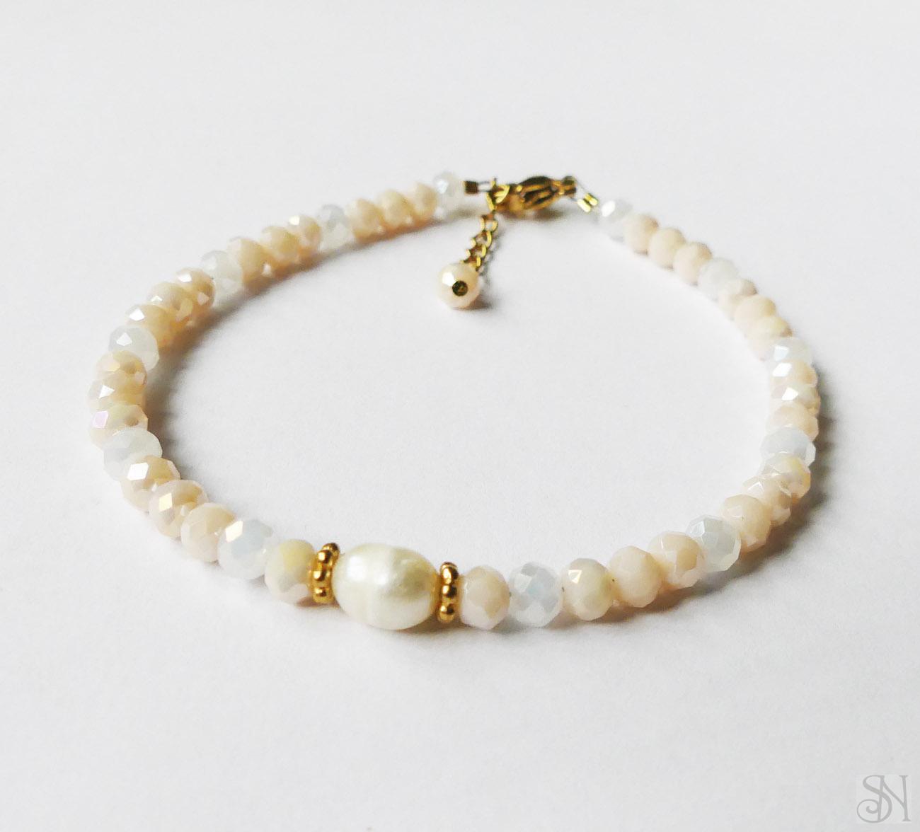 Handmade zapínací náramok s riečnou perlou. Kvalitné sklenené korálky sú navliekané na oceľovom lanku. Kovové komponenty sú z chirurgickej ocele zlatej farby. Zapínanie je na karabínku.