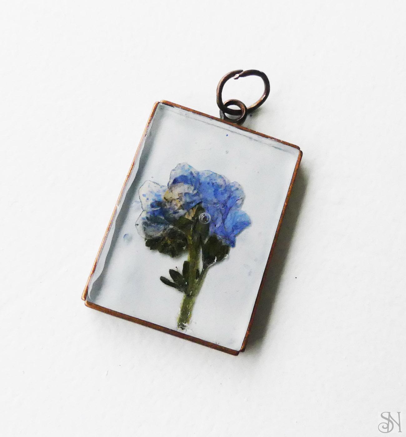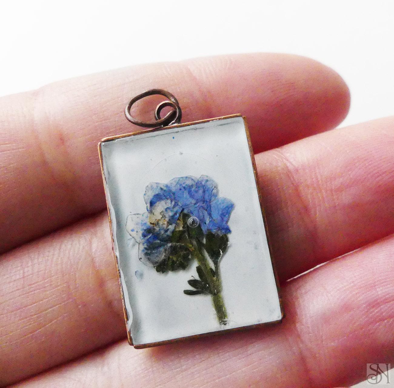 Originálny handmade prívesok s kvetom nezábudky v kovovom lôžku medenej farby. Je ručne odlievaný zo živice. Prívesok je doplnený krúžkom na zavesenie. Kovové časti sú z bižutérneho kovu bez obsahu niklu. K prívesku zadarmo pridám aj bižutérnu retiazku alebo šnúrku zo svojich aktuálnych zásob, ktorú si môžete ľubovoľne meniť za iné.