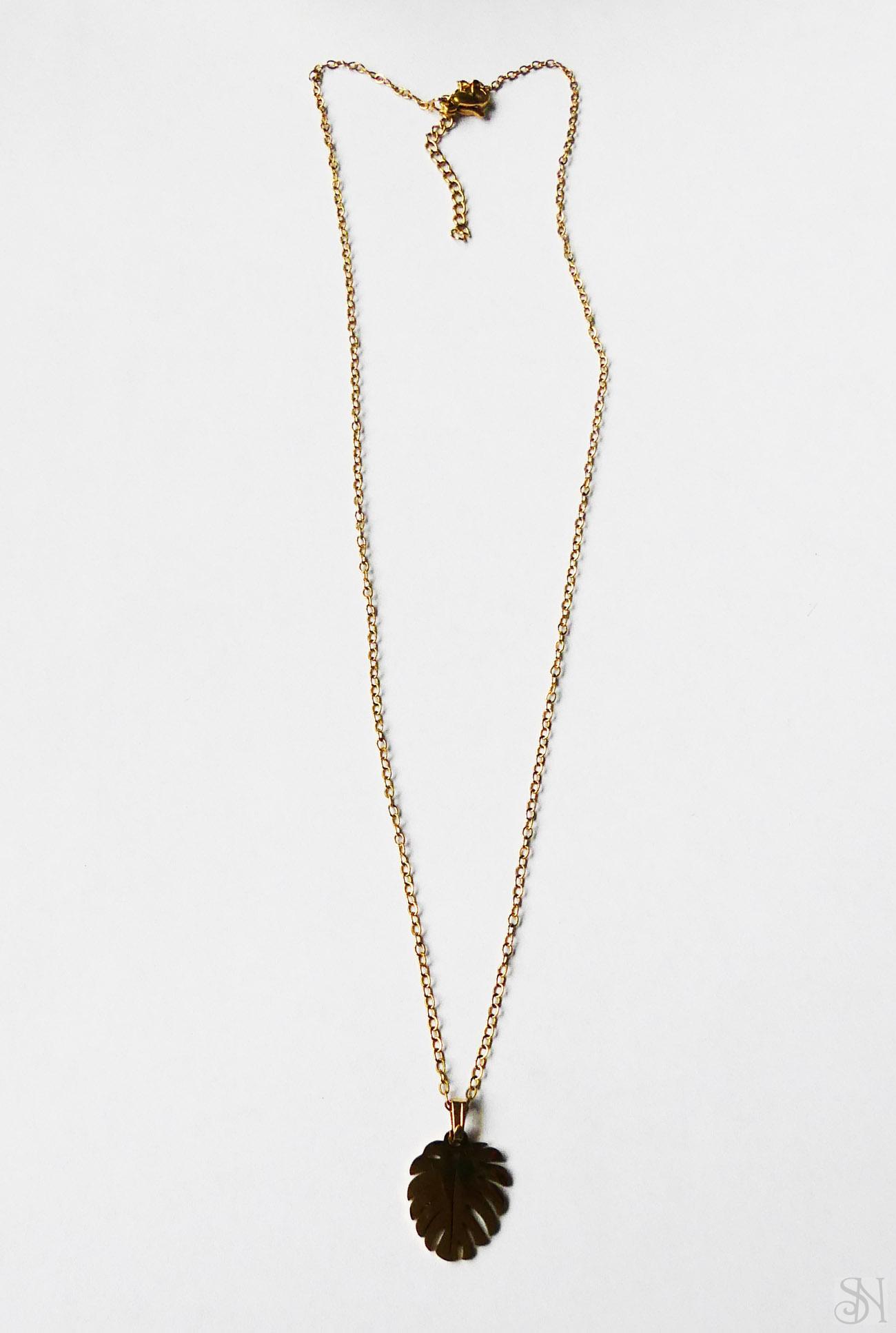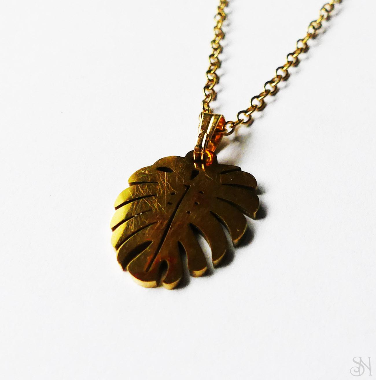 Zlatý zapínací náhrdelník s príveskom v tvare listu monstery. Kovové komponenty sú z chirurgickej ocele v zlatej farbe. Zapínanie je na karabínku.