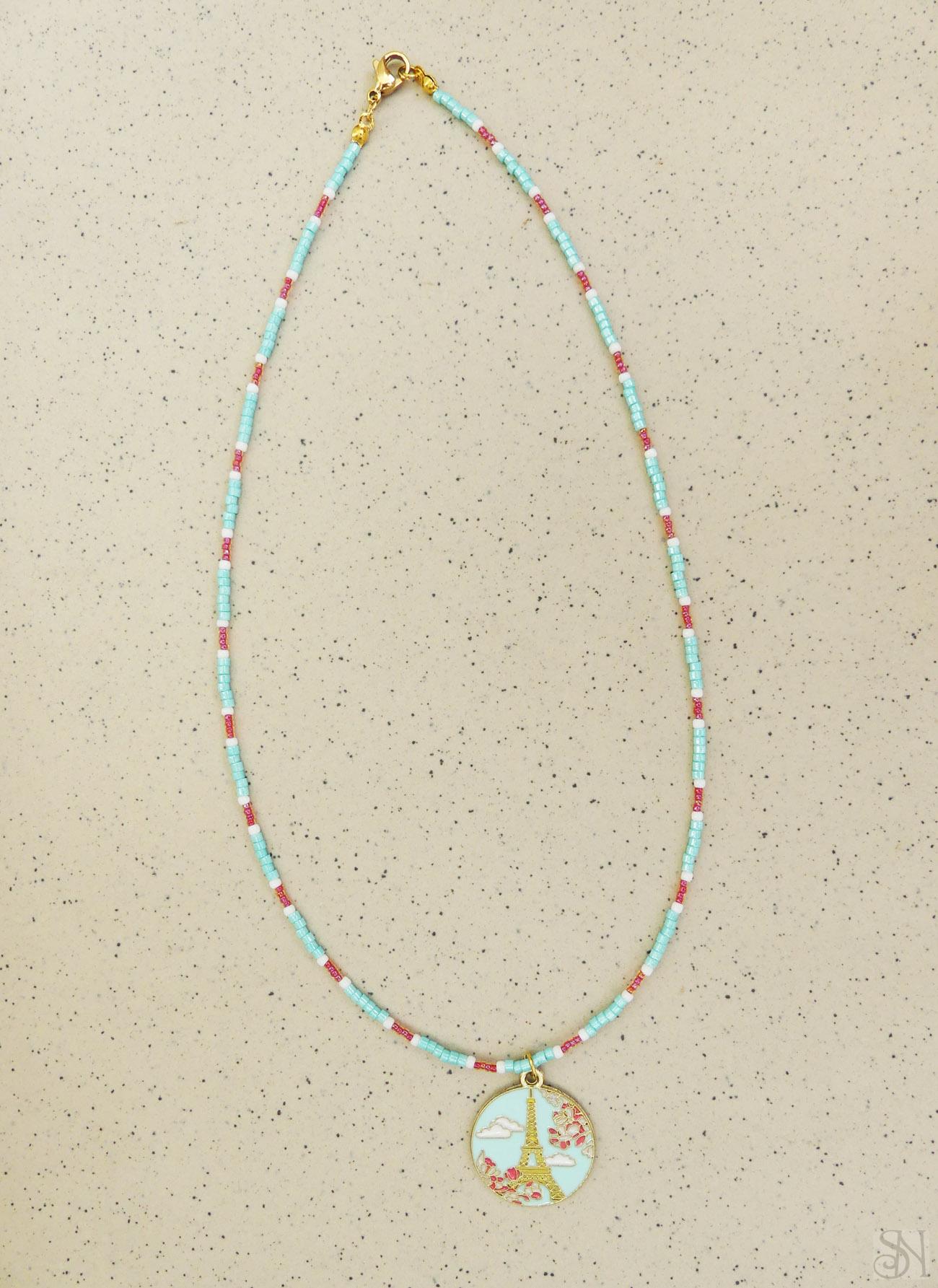 Modro-ružový náhrdelník s motívom Eiffelovej veže v Paríži pre všetky cestovateľky. Prívesok je bižutérny, zapínanie je z chirurgickej ocele.