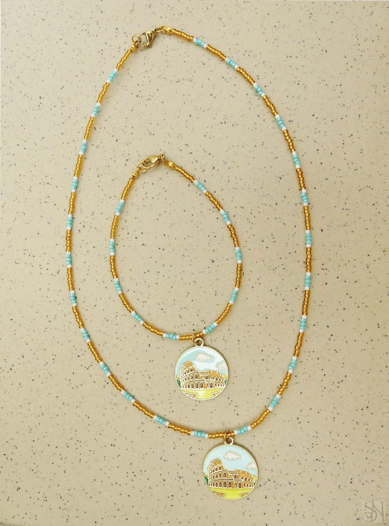 Tyrkysovo-zlatý náhrdelník s motívom Kolosea v Ríme pre všetky cestovateľky. Prívesok je bižutérny, zapínanie je z chirurgickej ocele.