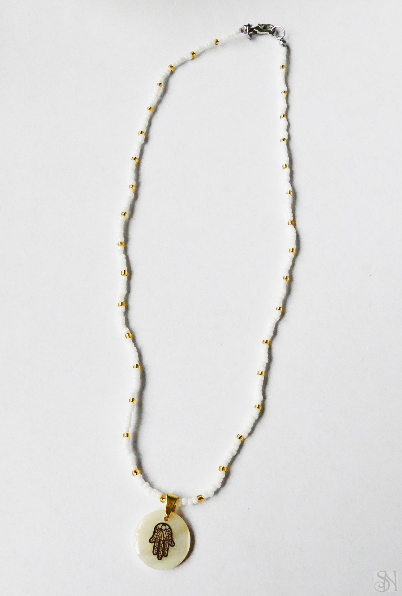Handmade bielo-zlatý zapínací náhrdelník s perleťovým príveskom. Vyrobený je z kvalitných japonských korálok. Kovové komponenty sú z chirurgickej ocele v striebornej farbe. Zapínanie je na karabínku.