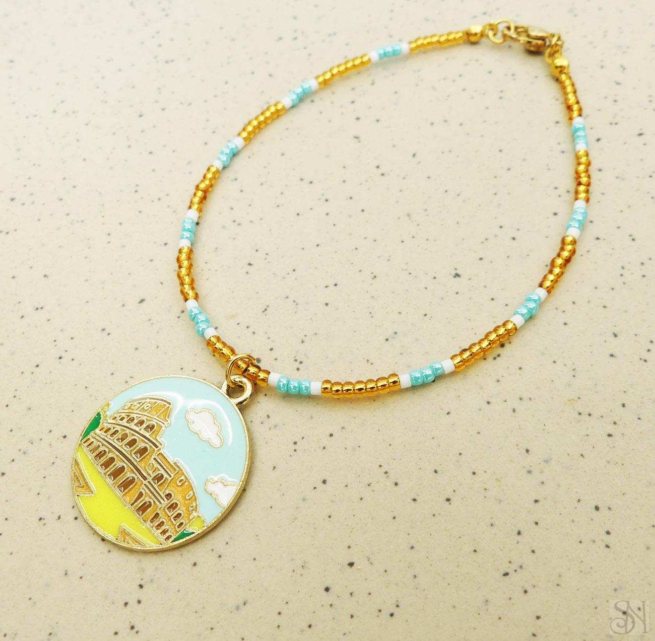 Tyrkysovo-zlatý náramok s motívom Kolosea v Ríme pre všetky cestovateľky. Prívesok je bižutérny, zapínanie je z chirurgickej ocele.