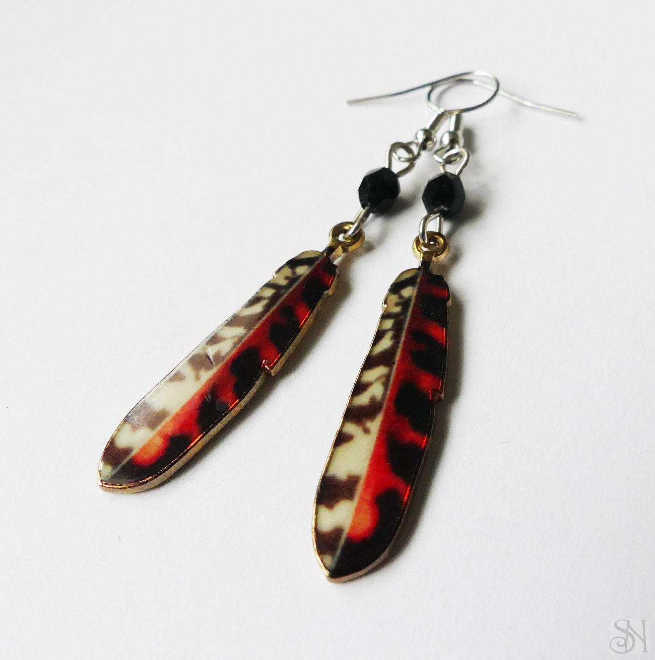 Náušnice v tvare pierok vyrobené z korálok. Dopĺňajú ich komponenty z chirurgickej ocele, preto sú vhodné aj pre alergikov.