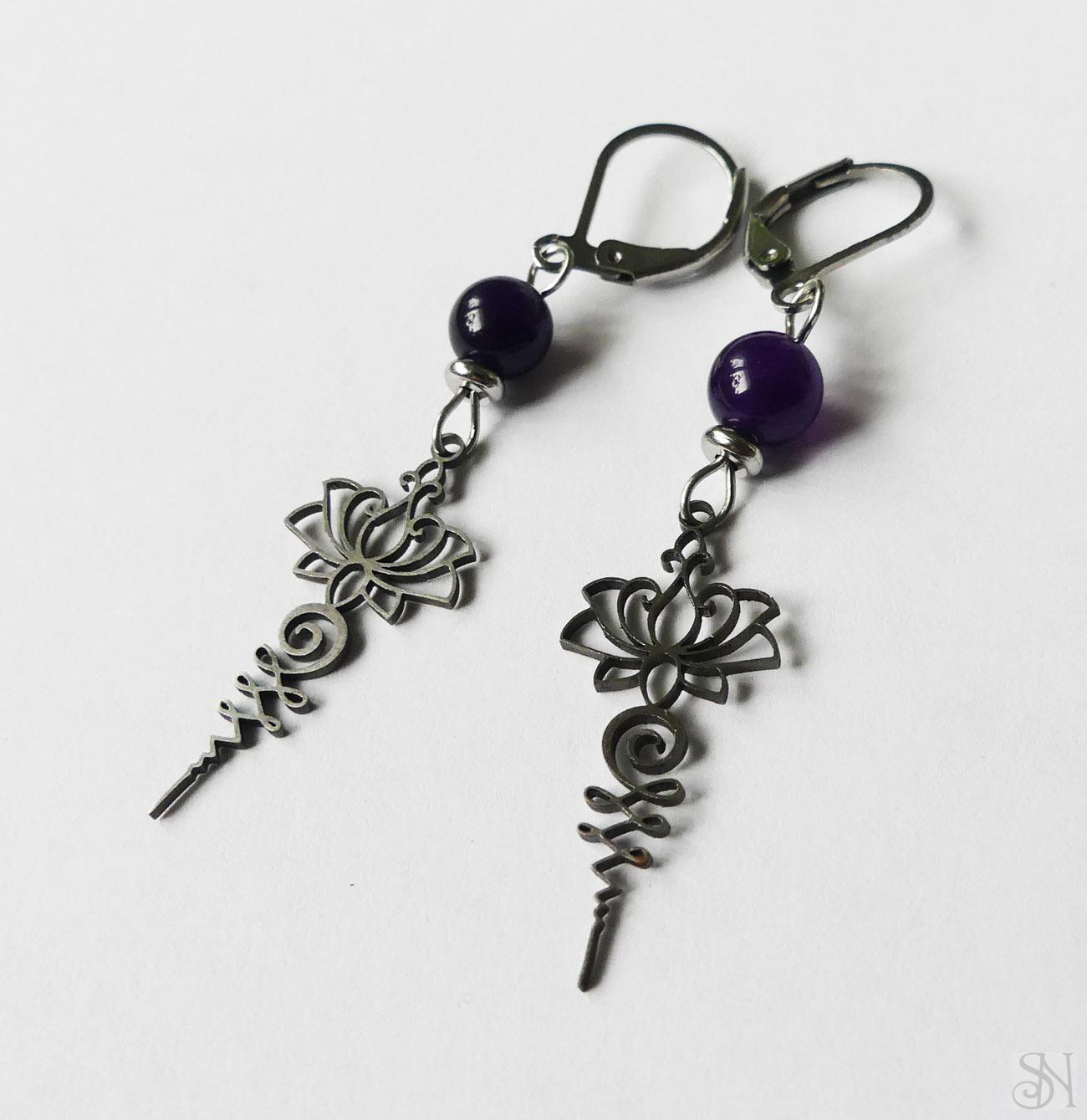 Handmade náušnice strieborné lotosy s liečivým kameňom ametystom - chirurgická oceľ
