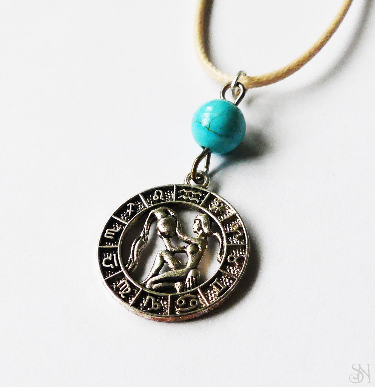 Ručne vyrobený prívesok z korálky liečivého kameňa tyrkenitu a bižutérneho komponentu so znamením vodnár. Kovové komponenty sú bez obsahu niklu. Prívesok posielame zavesený na šnúrke. Velkosť cca 3 cm.