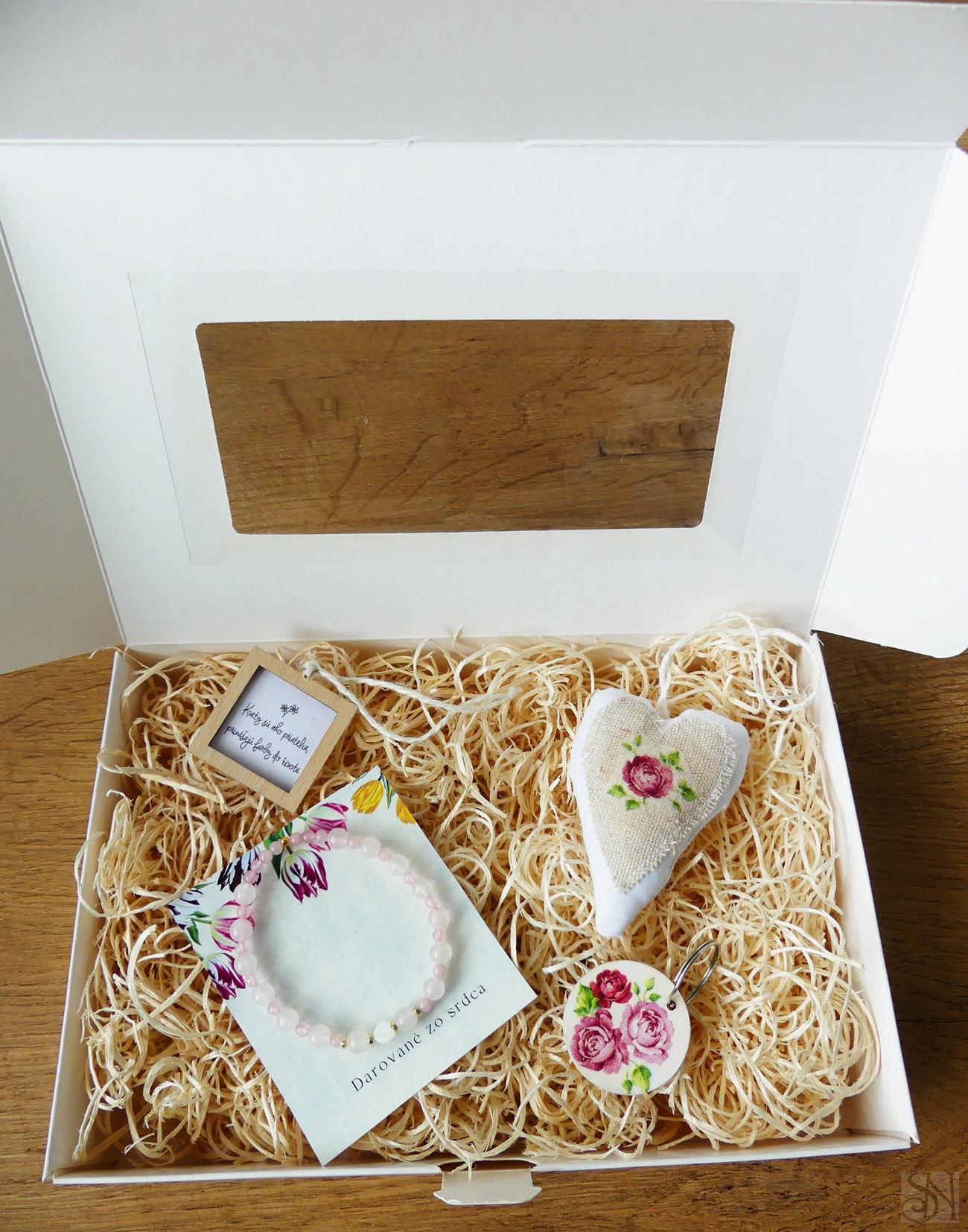 Úvod » Darčekové boxy » Handmade ružičkový darčekový box s náramkom, kľúčenkou a dekoráciami
