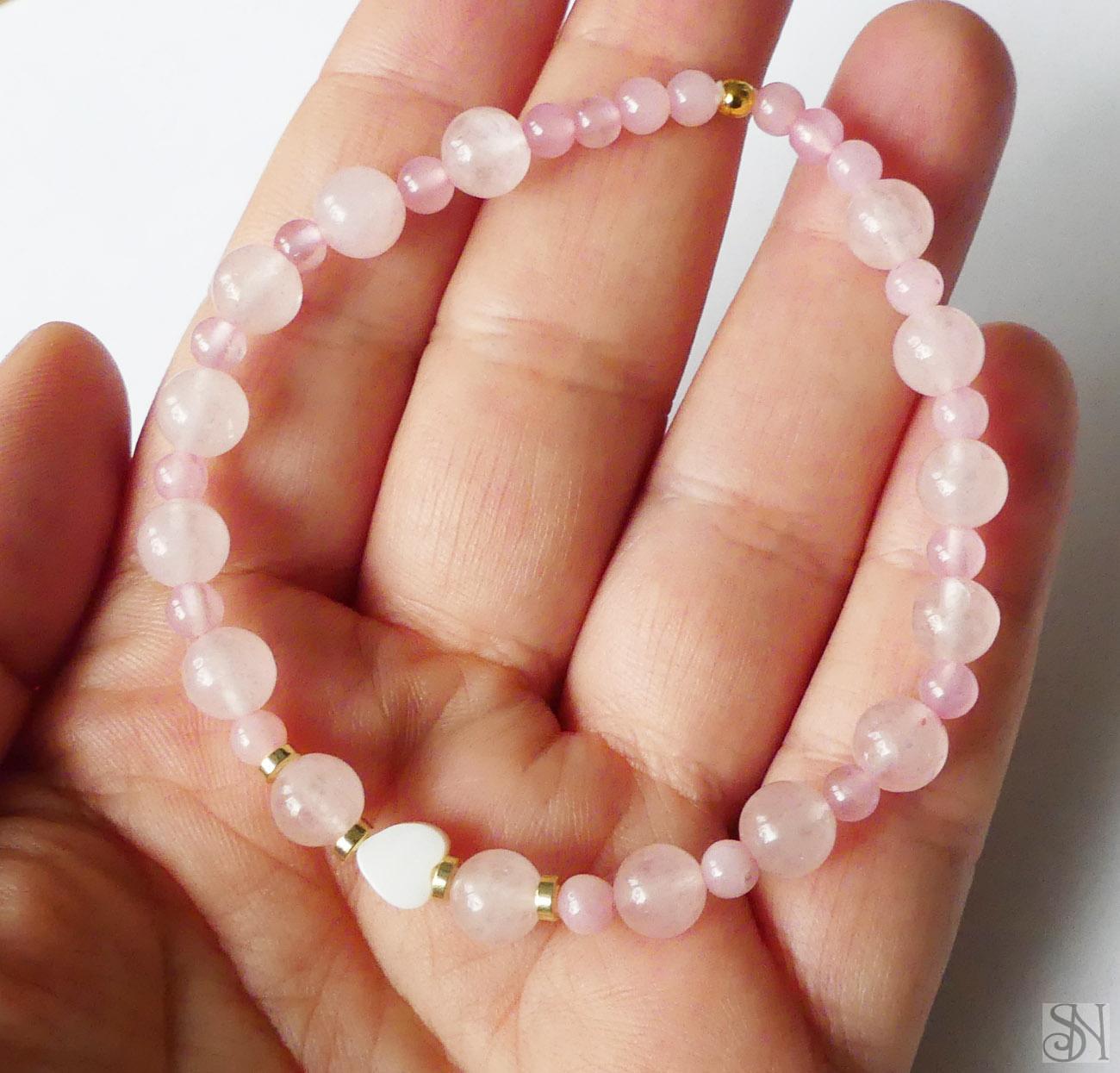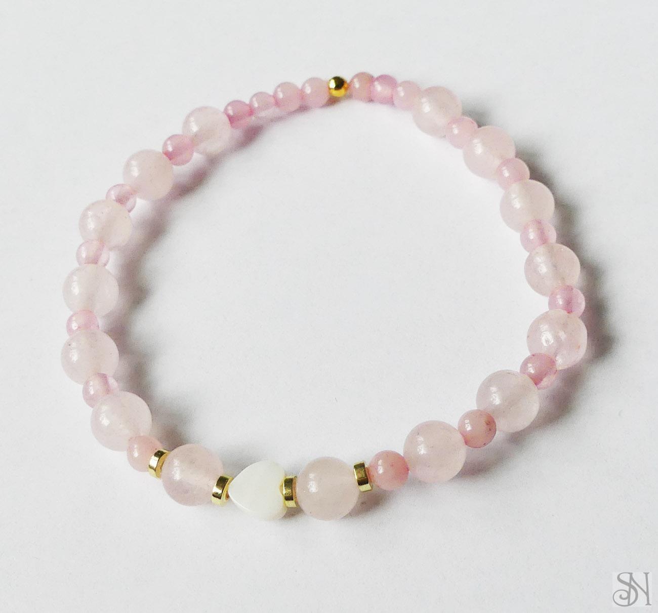 Handmade náramok na gumičke z liečivého kameňa ruženínu a perleťového srdiečka s drobnými korálkami hematitu.