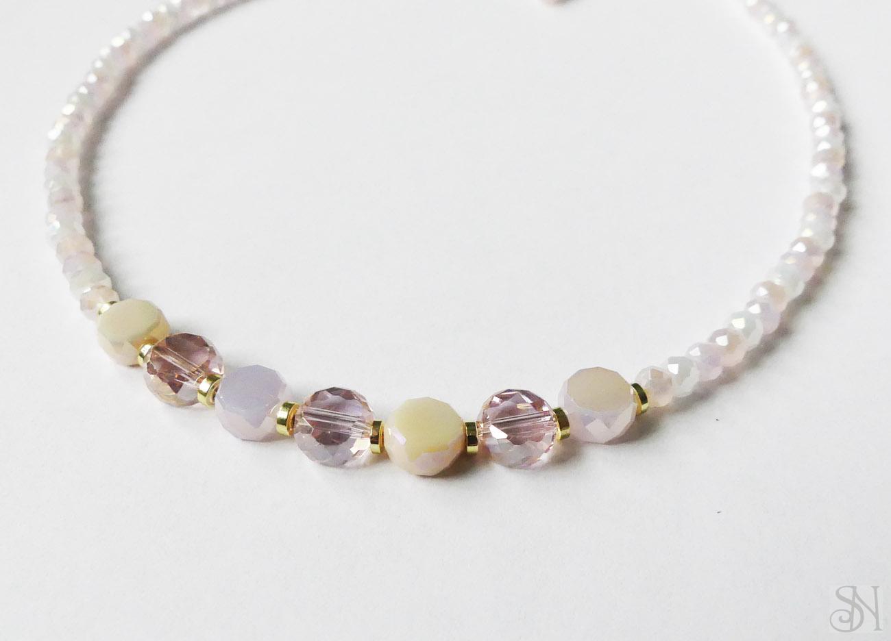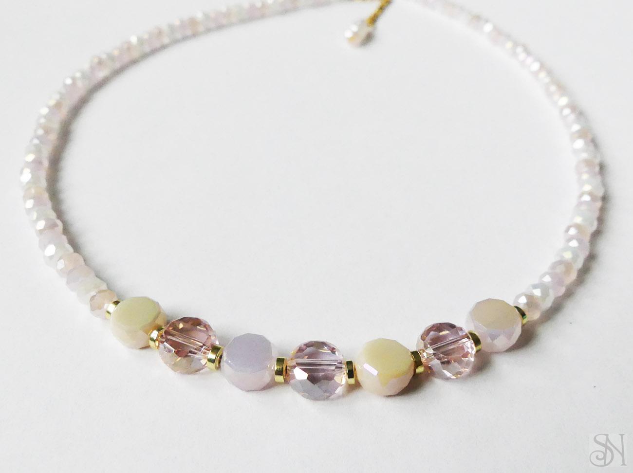 Handmade ružový zapínací náhrdelník. Kvalitné sklenené korálky sú navliekané na oceľovom lanku. Kovové komponenty sú z chirurgickej ocele zlatej farby. Zapínanie je na karabínku.