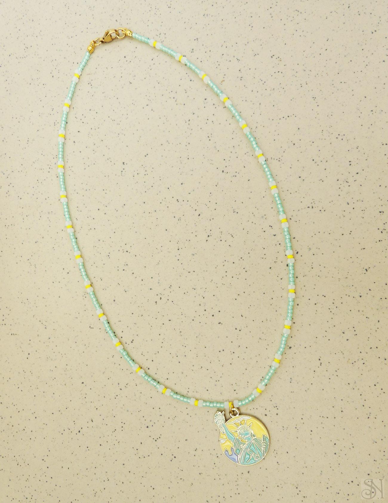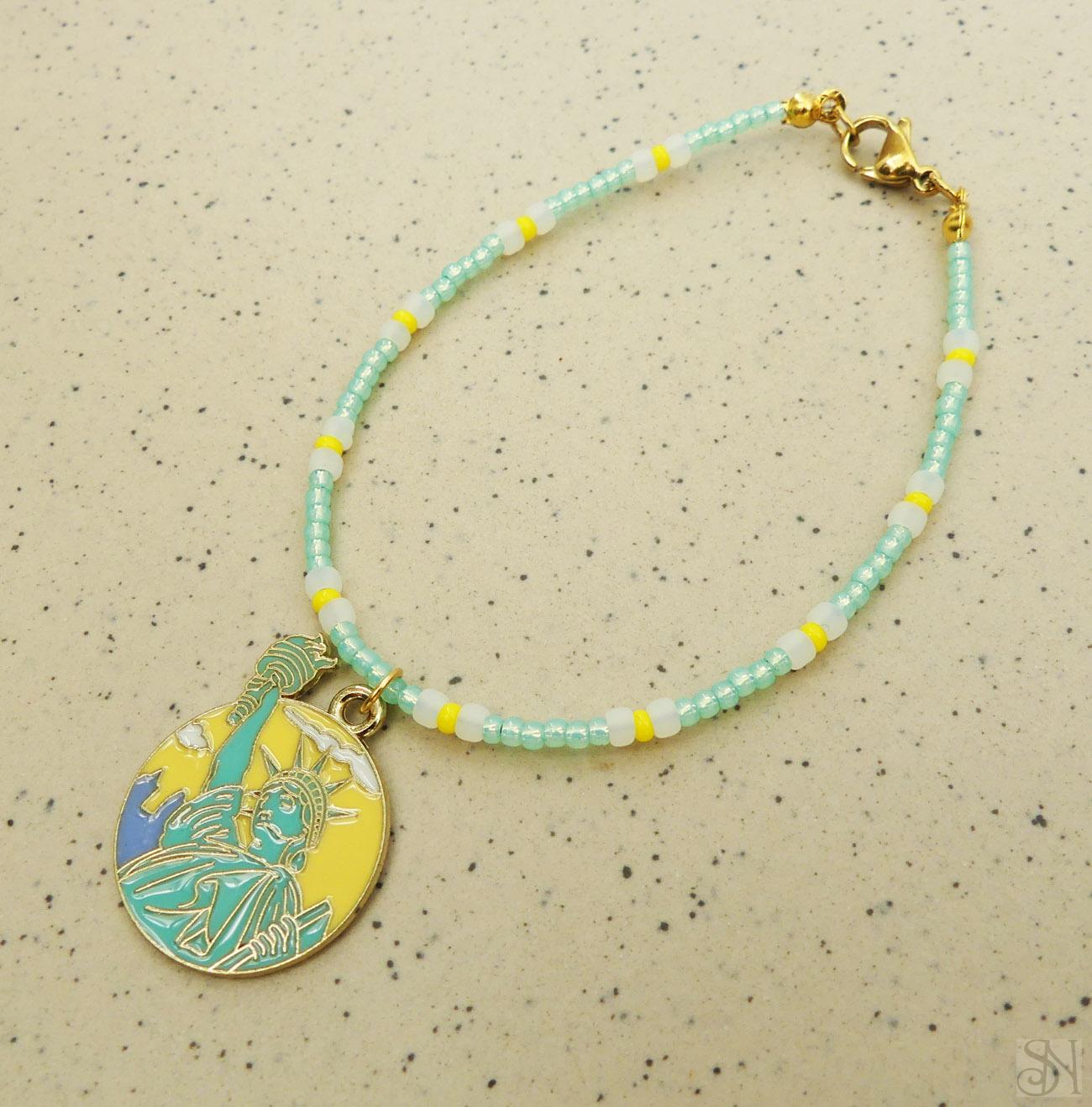 Tyrkysovo-žltý náramok a náhrdelník s motívom Sochy Slobody v New Yorku pre všetky cestovateľky. Prívesok je bižutérny, zapínanie je z chirurgickej ocele.
