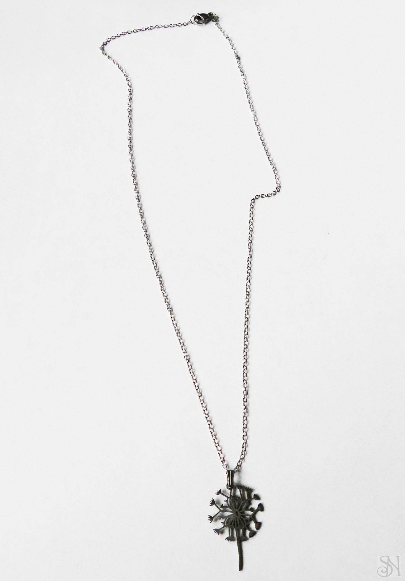 Strieborný zapínací náhrdelník s príveskom v tvare púpavy. Kovové komponenty sú z chirurgickej ocele v striebornej farbe. Zapínanie je na karabínku.
