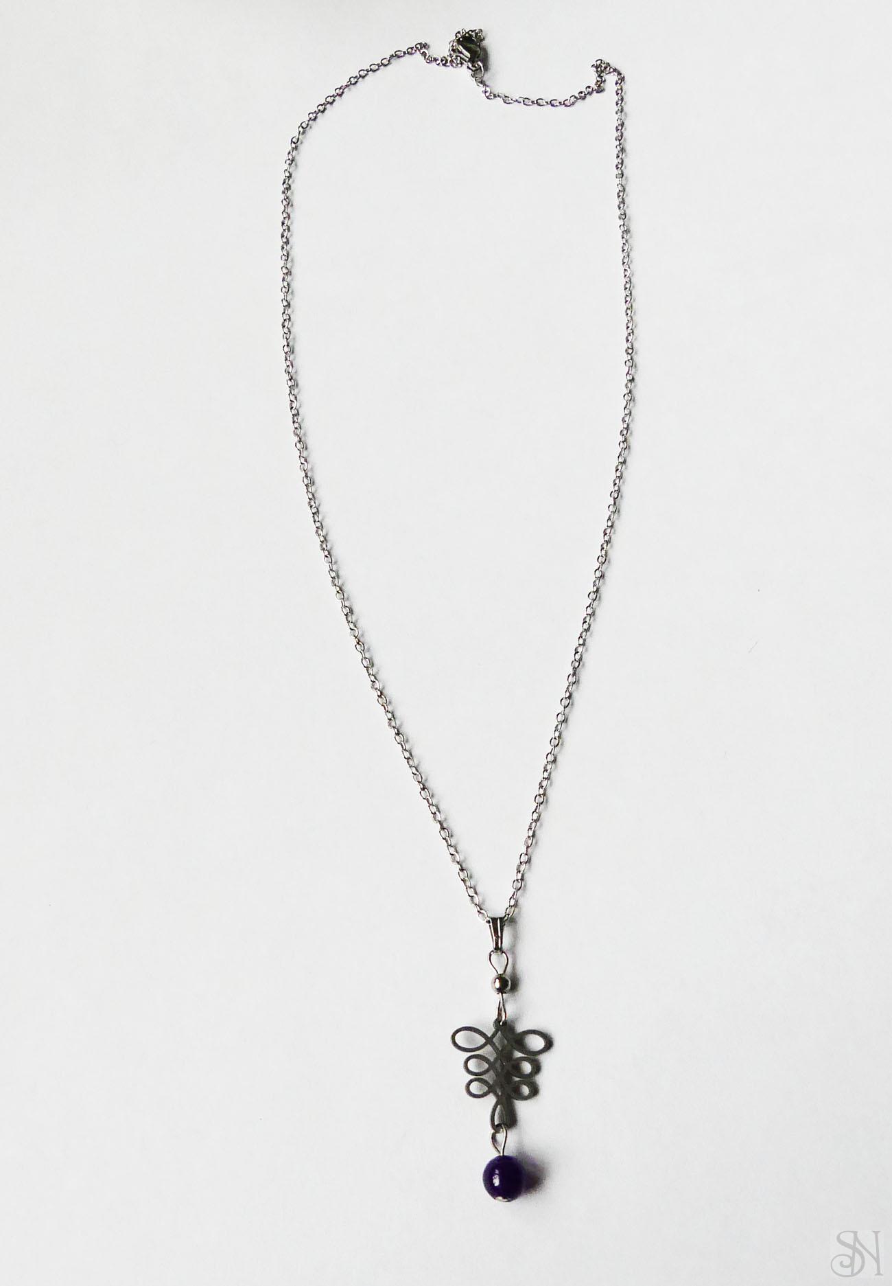 Strieborný zapínací náhrdelník s príveskom s liečivým kameňom ametystom. Kovové komponenty sú z chirurgickej ocele v striebornej farbe. Zapínanie je na karabínku.