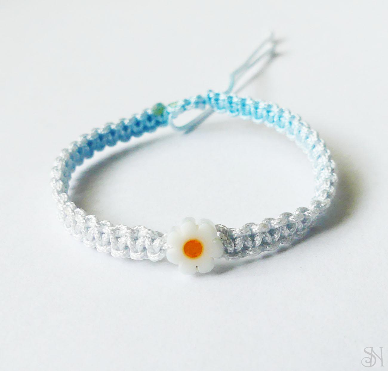 Modrý náramok vyrobený zo šnúrky s korálkou. Praktické posuvné makramé zapínanie - náramok sa roztiahne a stiahne podľa potreby. Veľkosť vhodná na detskú ruku.