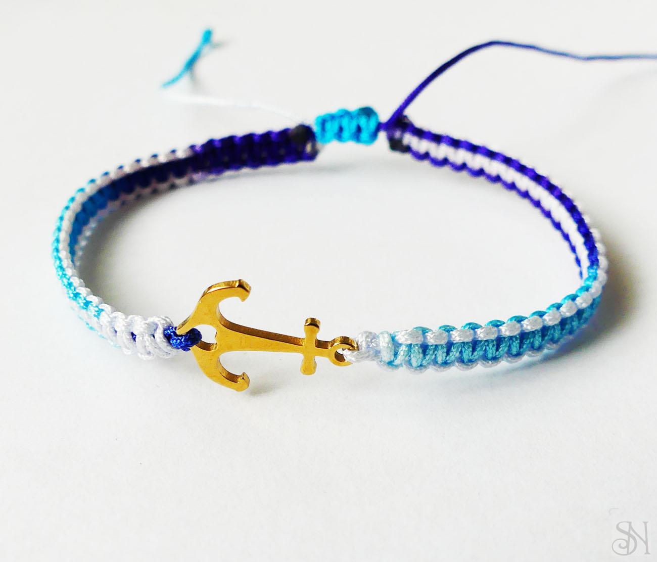 Modrý pletený náramok vyrobený zo šnúrky a kovového komponentu z chirurgickej ocele. Praktické posuvné makramé zapínanie - náramok sa roztiahne a stiahne podľa potreby.