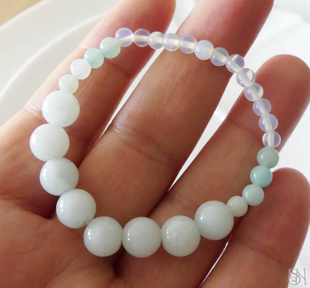 Handmade náramok na gumičke s korálkami z liečivých kameňov amazonitu, mesačného kameňa a jadeitu.