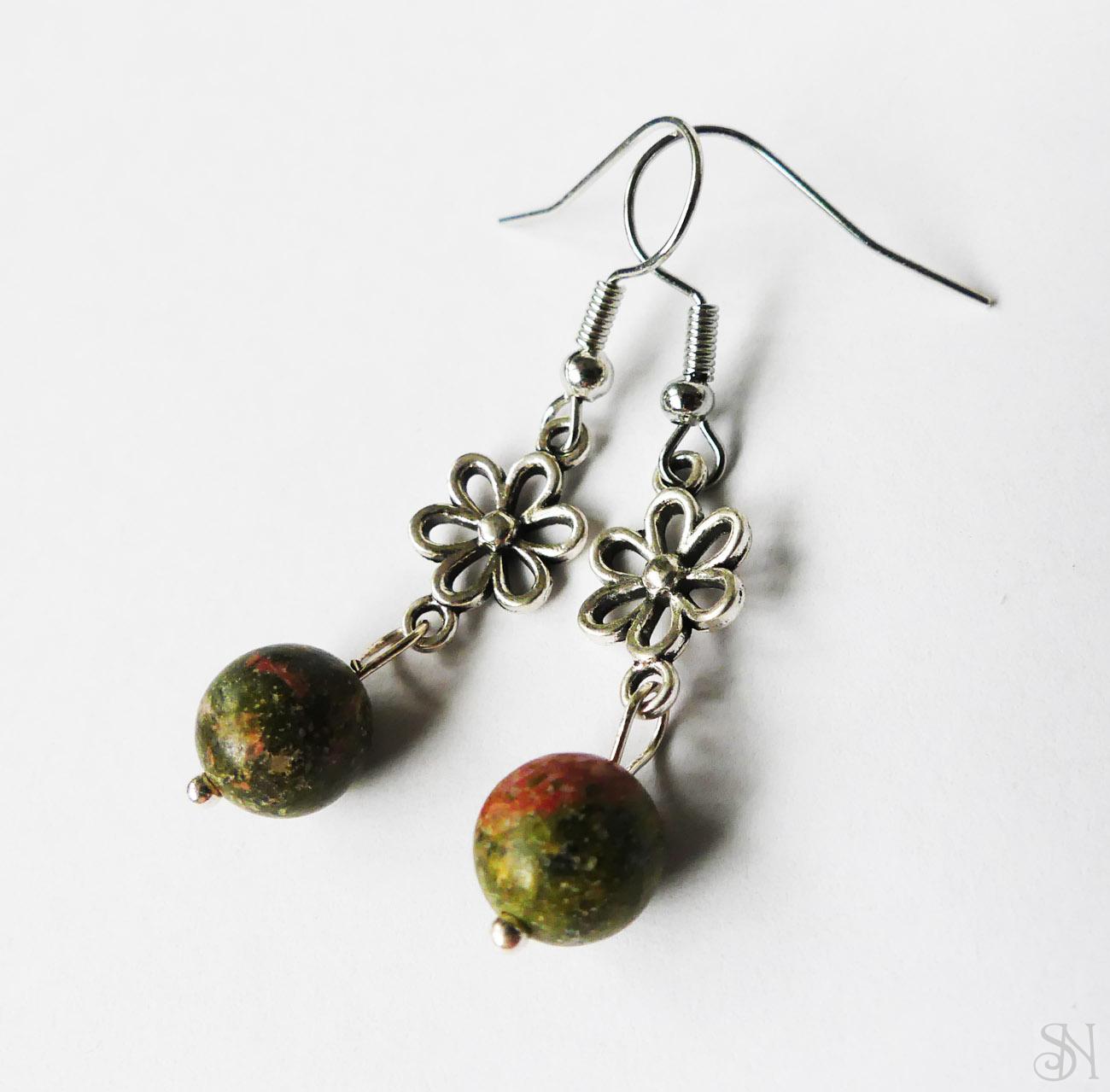 Handmade visiace náušnice z liečivého minerálu unakitu. Náušnice sú doplnené háčikmi z chirurgickej ocele preto sú vhodné aj pre alergikov.