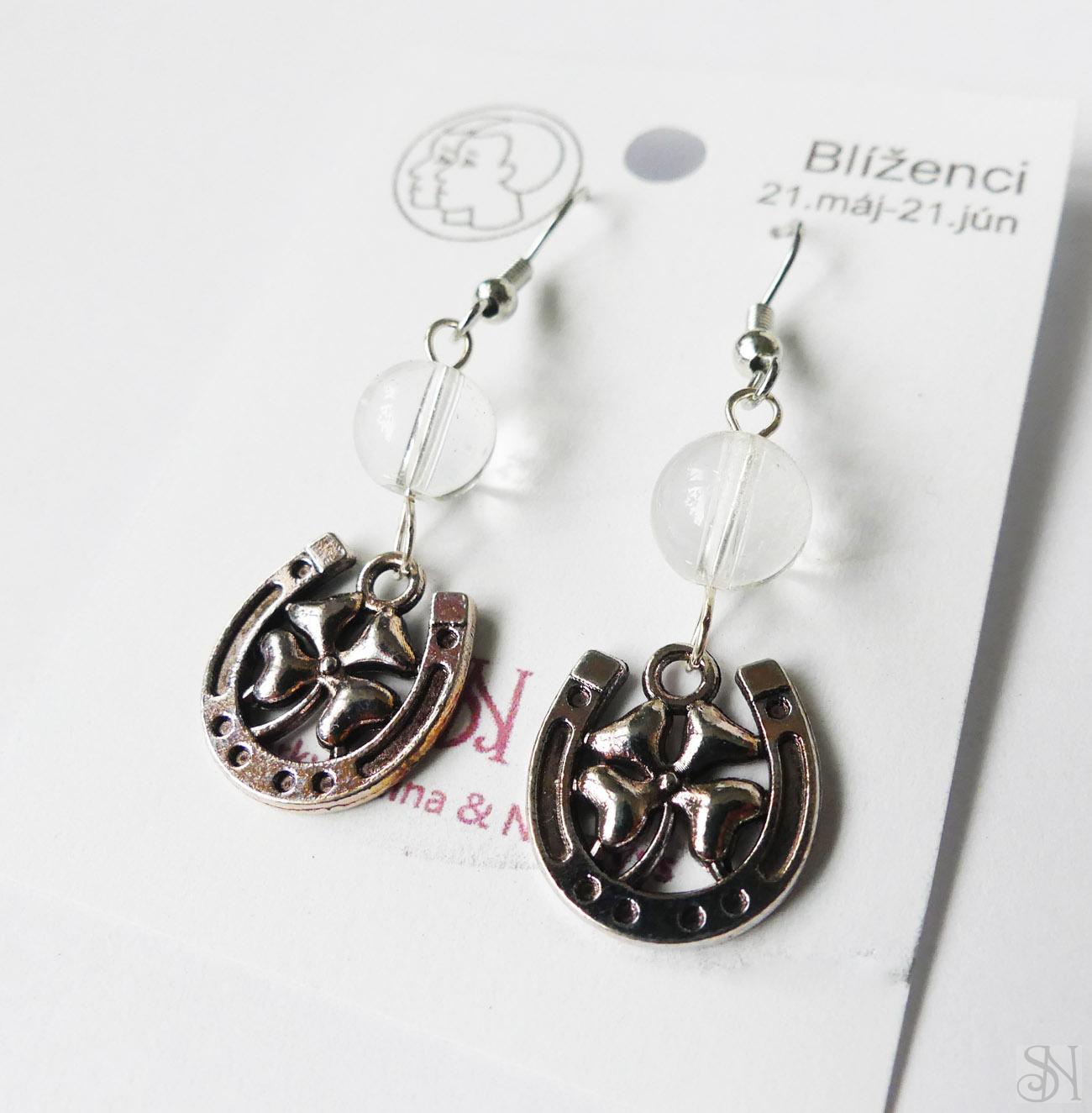Handmade visiace náušnice v tvare podkovy z liečivého minerálu krištálu pre znamenie blíženca. Náušnice sú doplnené kovovými komponentami z chirurgickej ocele preto sú vhodné aj pre alergikov.