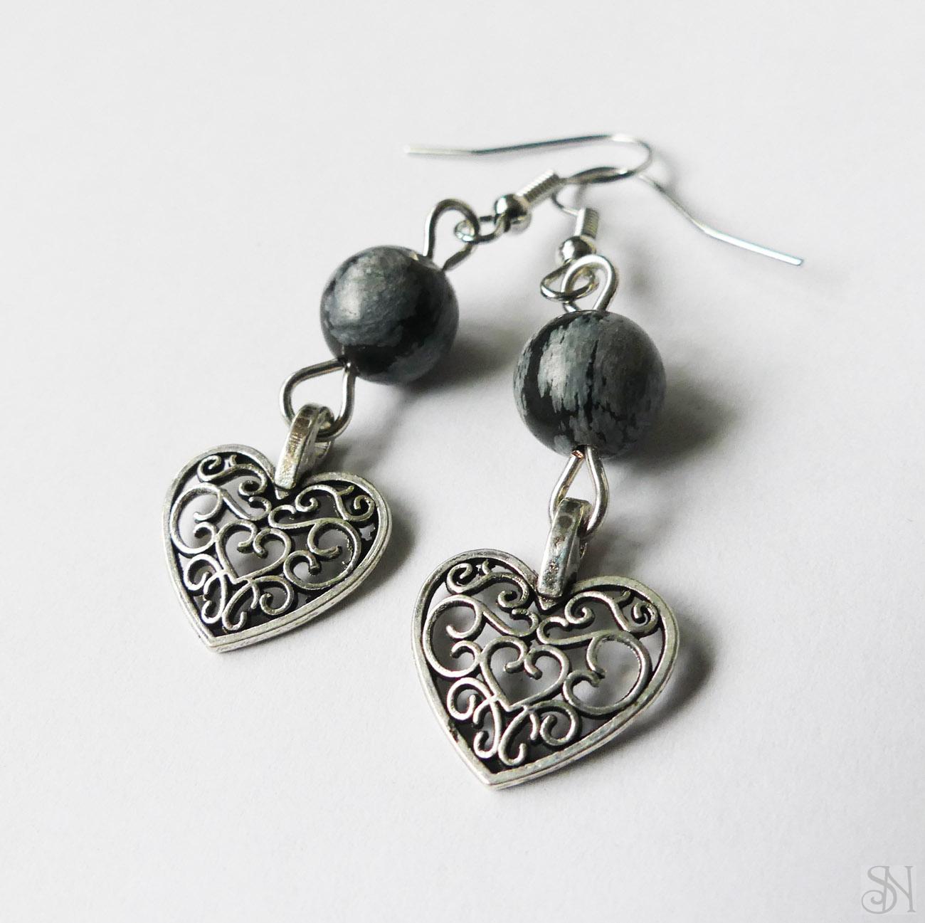 Handmade visiace náušnice z liečivého minerálu obsidiánu vločkového. Náušnice sú doplnené háčikmi z chirurgickej ocele preto sú vhodné aj pre alergikov.