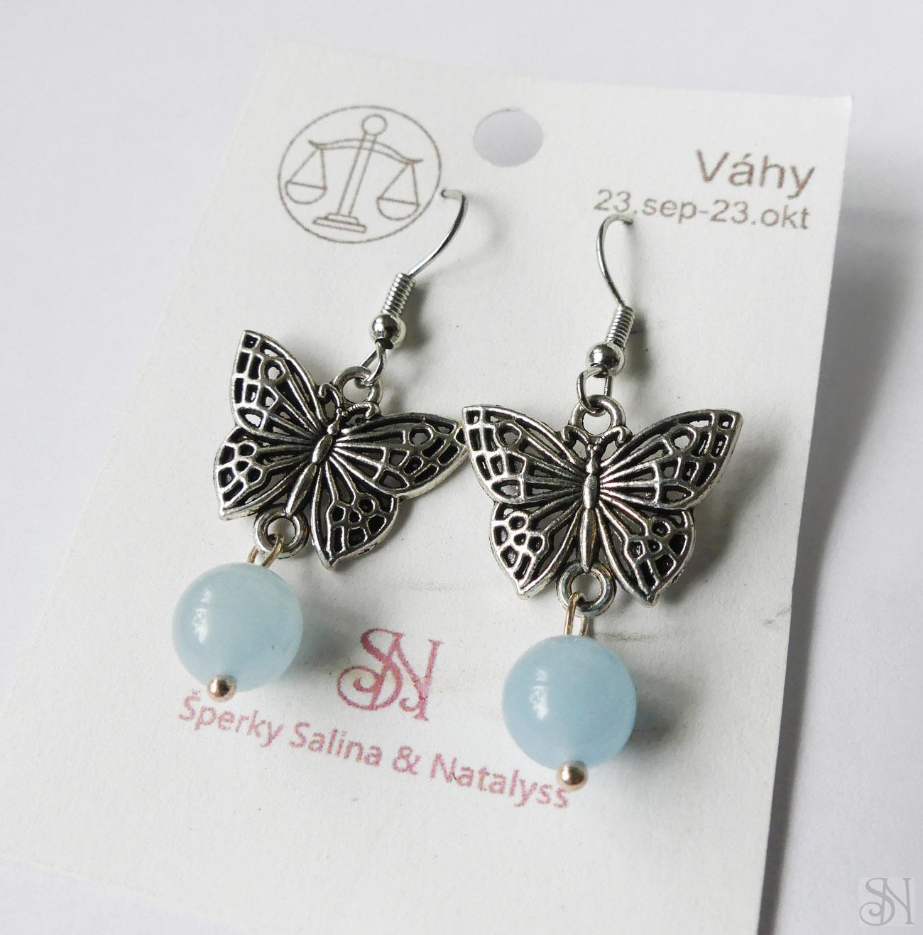 Handmade visiace náušnice motýle z liečivého minerálu akvamarínu pre znamenie váhy. Náušnice sú doplnené kovovými komponentami z chirurgickej ocele preto sú vhodné aj pre alergikov.