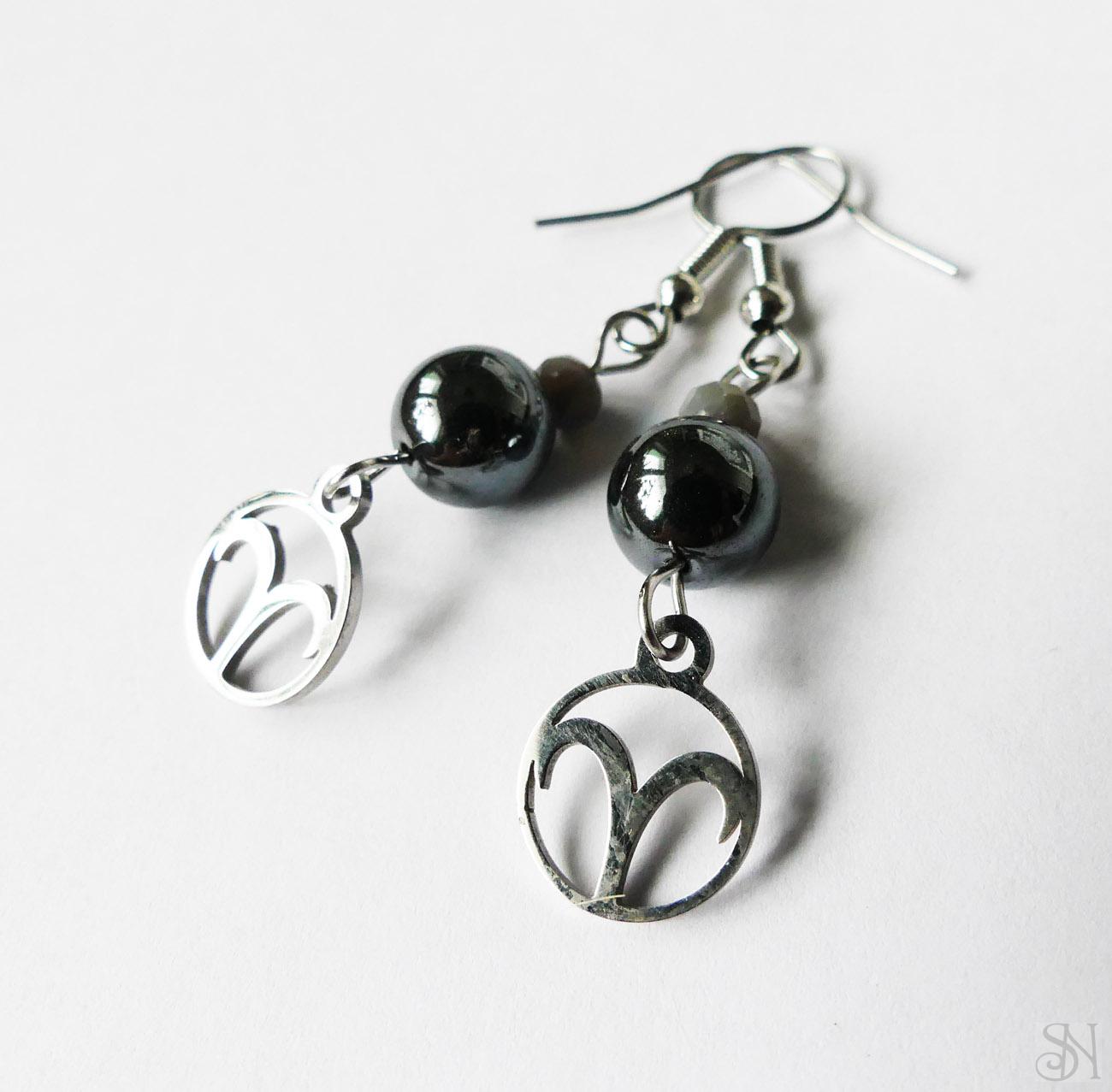 Handmade visiace náušnice z liečivého minerálu hematitu pre znamenie barana. Náušnice sú doplnené kovovými komponentami z chirurgickej ocele, preto sú vhodné aj pre alergikov.