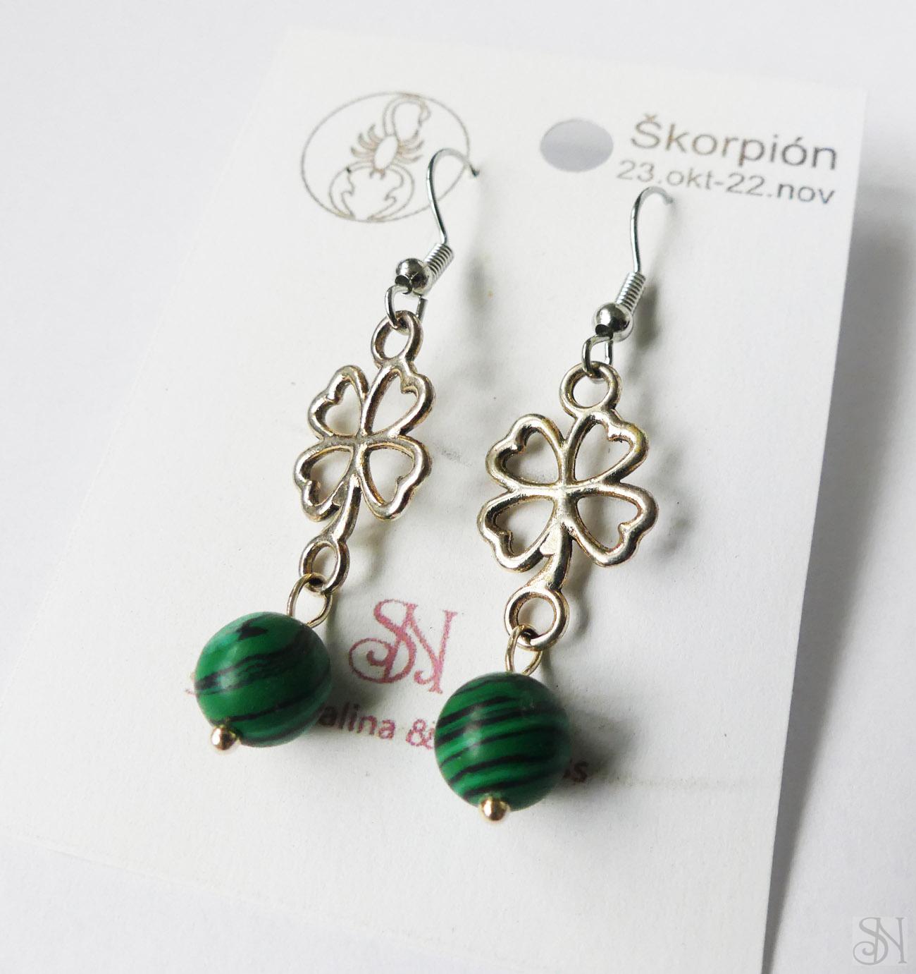Handmade visiace náušnice z liečivého minerálu malachitu pre znamenie škorpióna. Náušnice sú doplnené háčikmi z chirurgickej ocele preto sú vhodné aj pre alergikov.