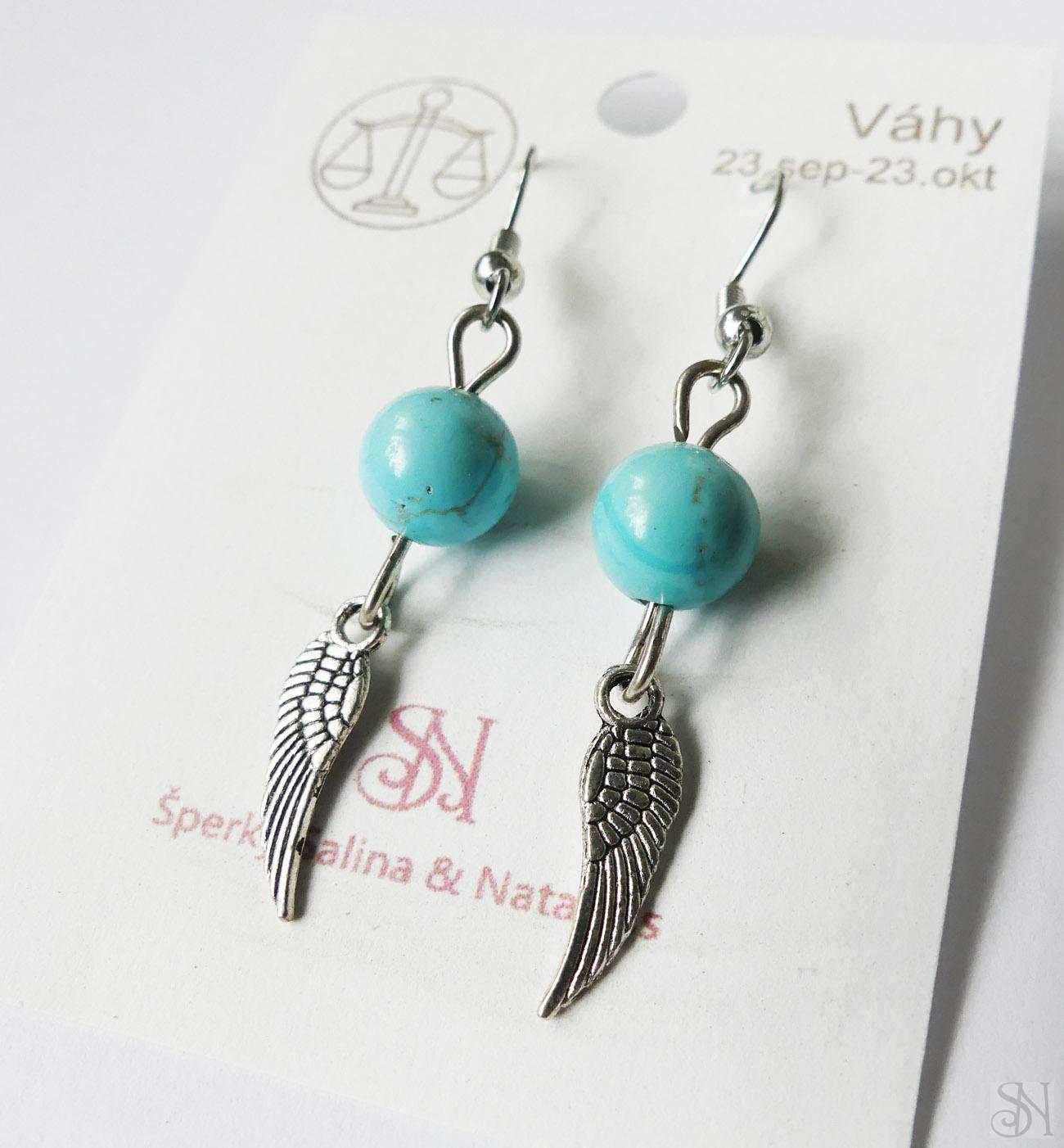 Handmade visiace náušnice anjelské krídla z liečivého minerálu tyrkenitu pre znamenie váhy. Náušnice sú doplnené kovovými komponentami z chirurgickej ocele preto sú vhodné aj pre alergikov.
