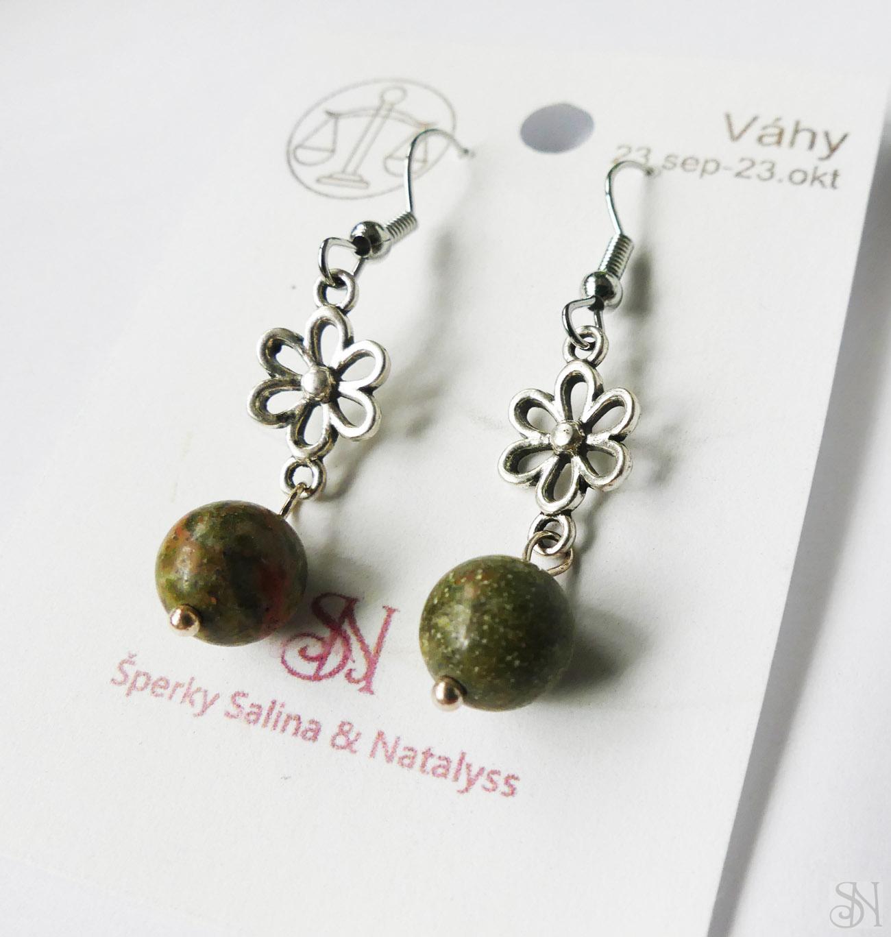 Handmade visiace náušnice kvety z liečivého minerálu unakitu pre znamenie váhy. Náušnice sú doplnené kovovými komponentami z chirurgickej ocele preto sú vhodné aj pre alergikov.