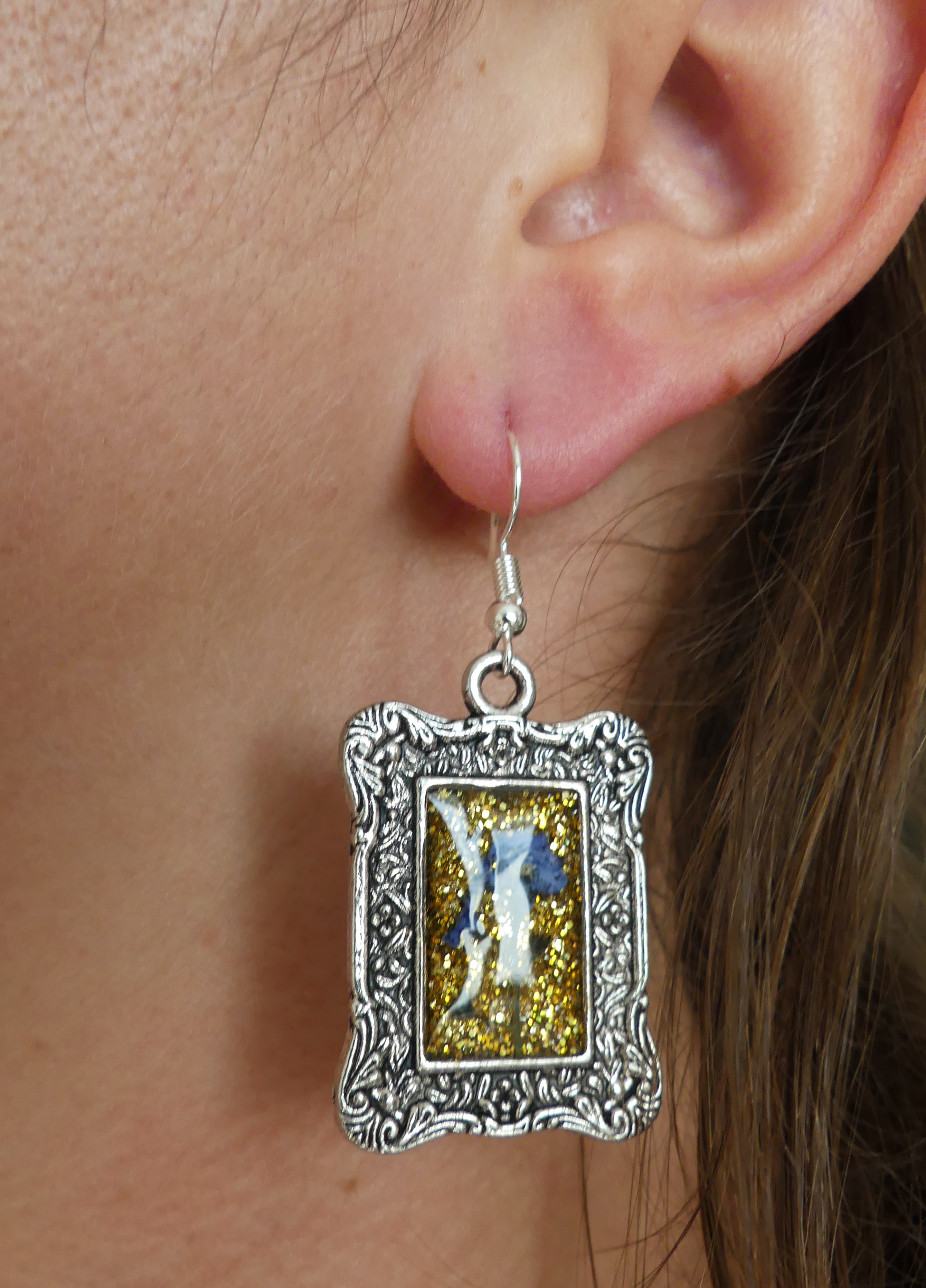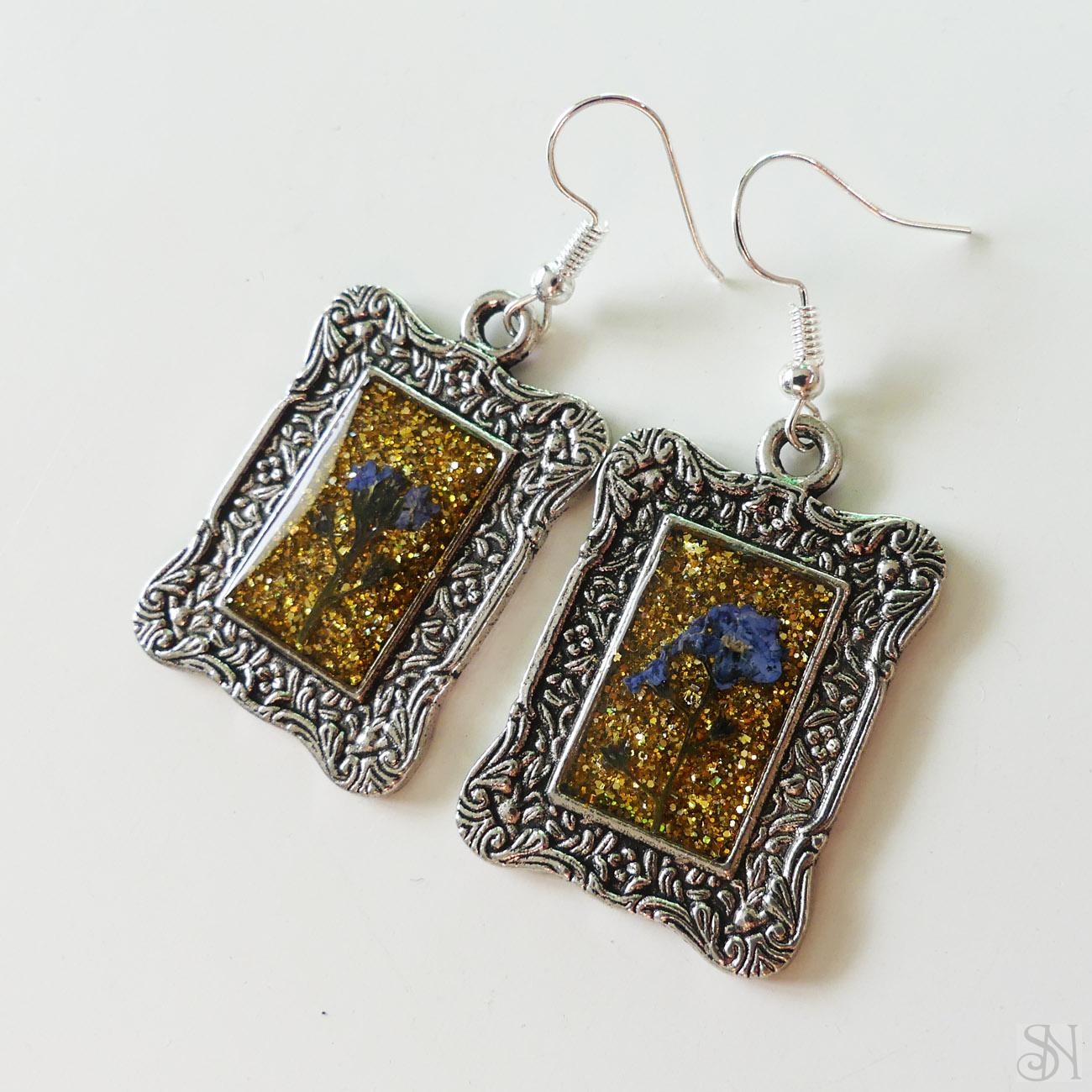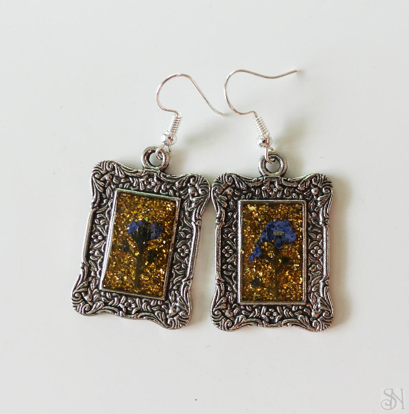 Originálne handmade náušnice s kvetom nezábudky v ozdobnom kovovom lôžku striebornej farby. Podklad tvoria zlaté trblietky. Náušnice sú ručne odlievané zo živice. Dopĺňa ich bižutéria - postriebrené kovové komponenty bez obsahu niklu. Pokiaľ máte alergiu na bižutérne kovy, môžete si v sekcii Doplnky, dokúpiť háčiky z chirurgickej ocele alebo striebra 925. Náušnice vám odošleme s vymenenými háčikmi.