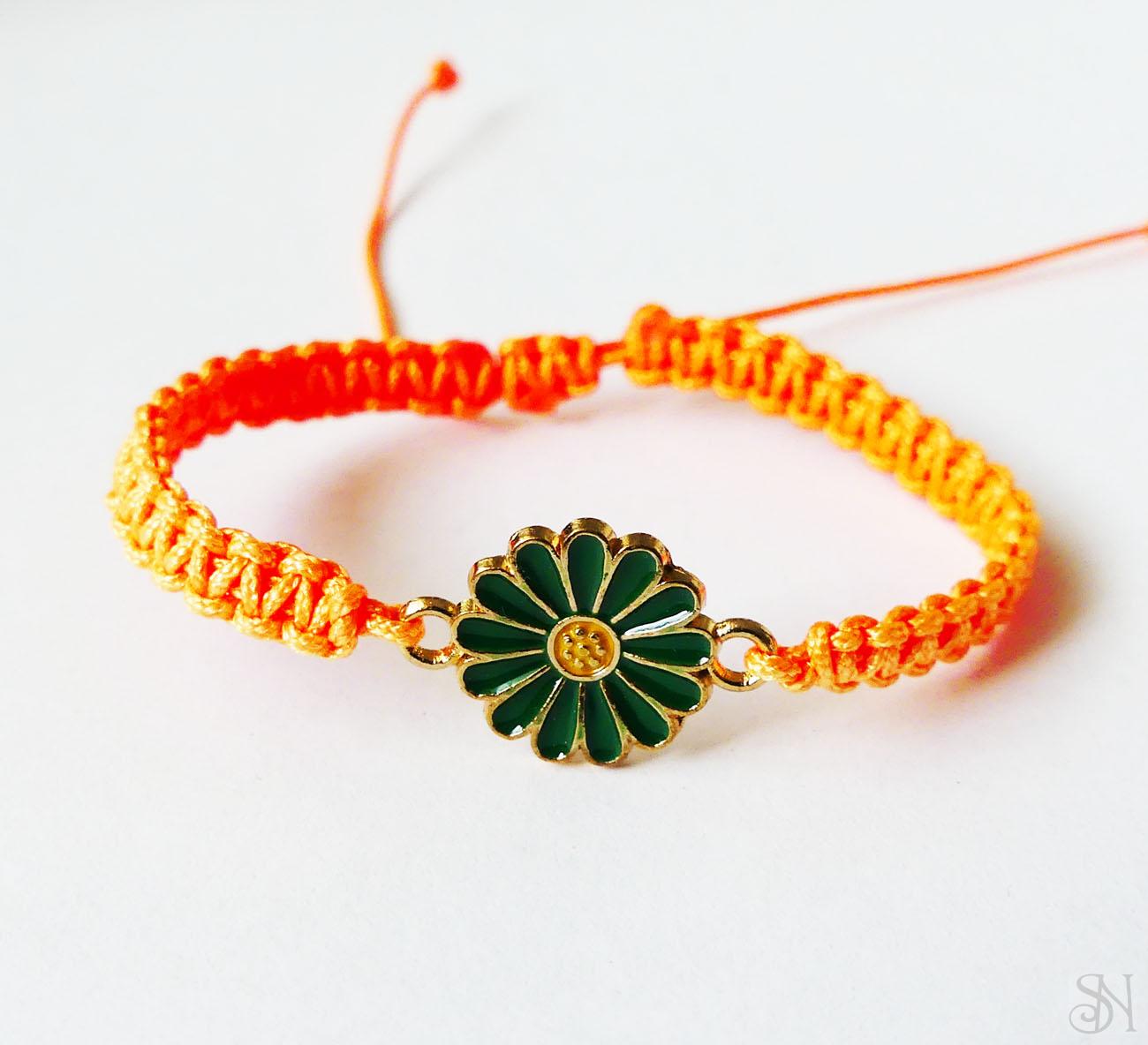 Oranžový náramok vyrobený zo šnúrky s korálkou kvetu. Praktické posuvné makramé zapínanie - náramok sa roztiahne a stiahne podľa potreby.