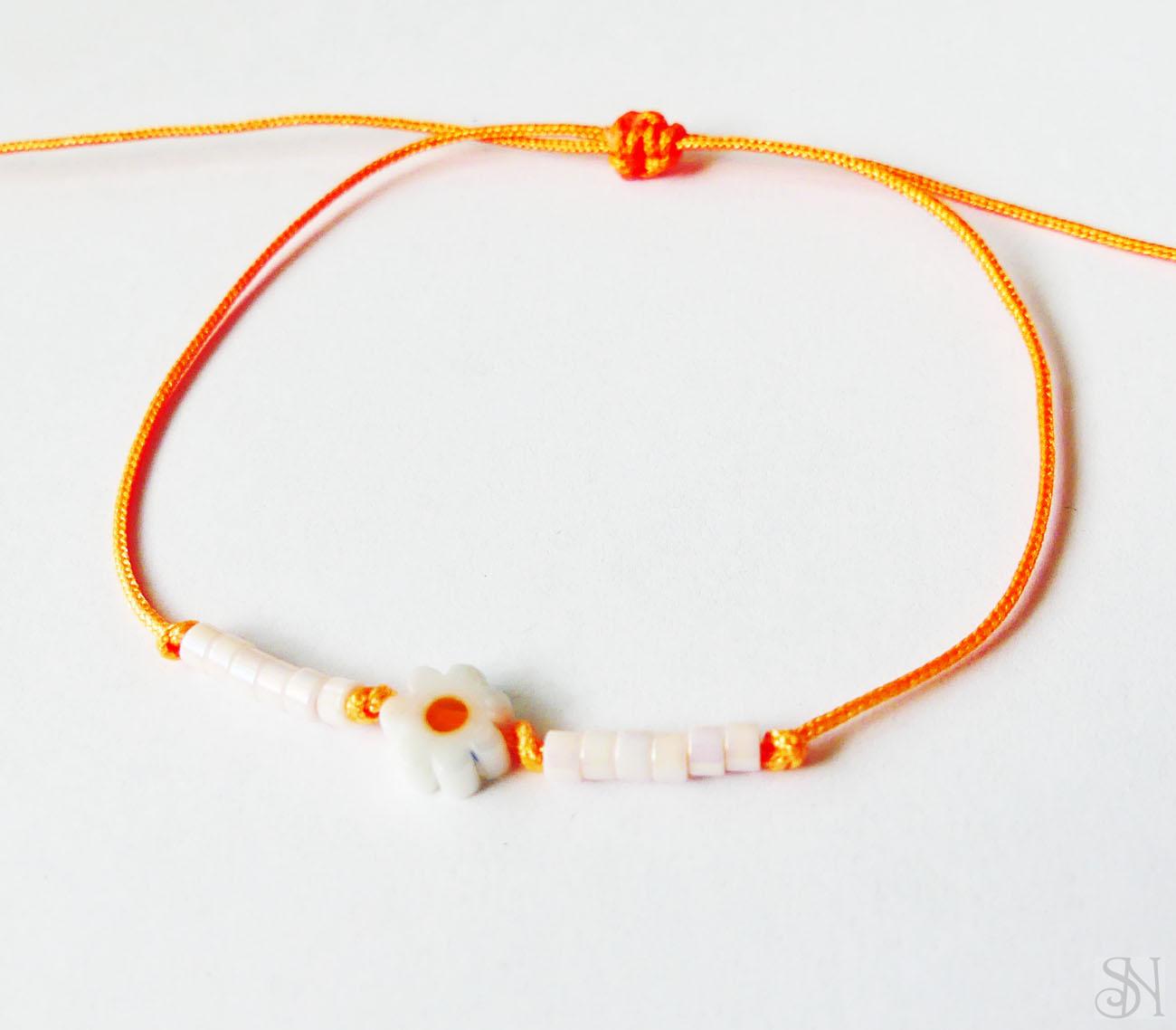 Oranžový zaťahovací šnúrkový náramok s korálkou kvetu.