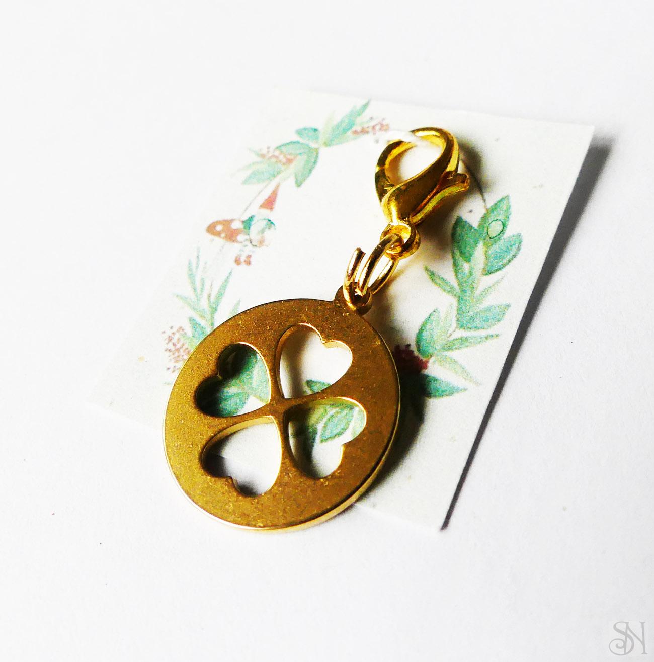 Prívesok na náramok v tvare štvorlístka vyrobený z kovových komponentov zlatej farby z chirurgickej ocele. Prívesok sa karabínkou zavesí na retiazku, ktorú si môžte u nás tiež zakúpiť a vytvoriť si vlastný VARIA náramok. Veľkosť prívesku aj s karabinkou je 2 cm.