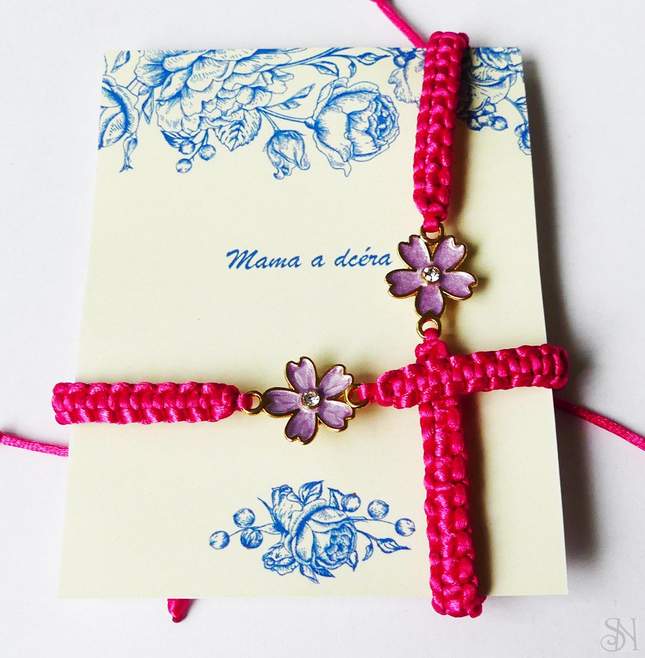Ružové náramky vyrobené zo šnúrky s príveskom kvetu na darčekovej kartičke s textom mama a dcéra. Praktické posuvné makramé zapínanie - náramok sa roztiahne a stiahne podľa potreby.