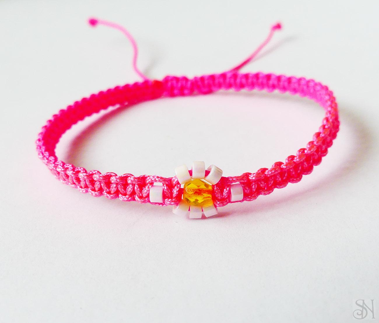 Ružový náramok vyrobený zo šnúrky s korálkami. Praktické posuvné makramé zapínanie - náramok sa roztiahne a stiahne podľa potreby.