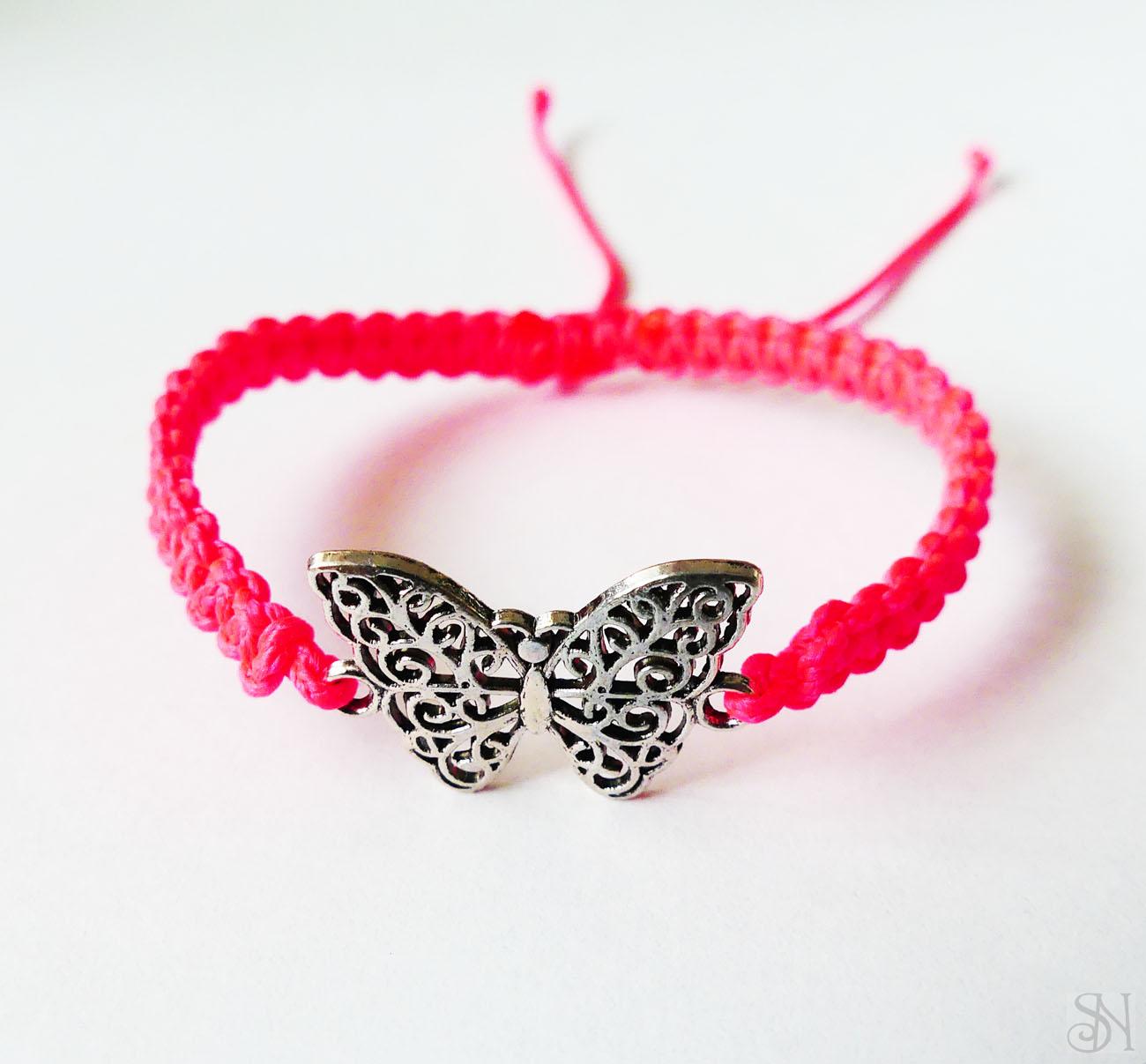 Ružový náramok vyrobený zo šnúrky s korálkou motýľa. Praktické posuvné makramé zapínanie - náramok sa roztiahne a stiahne podľa potreby.