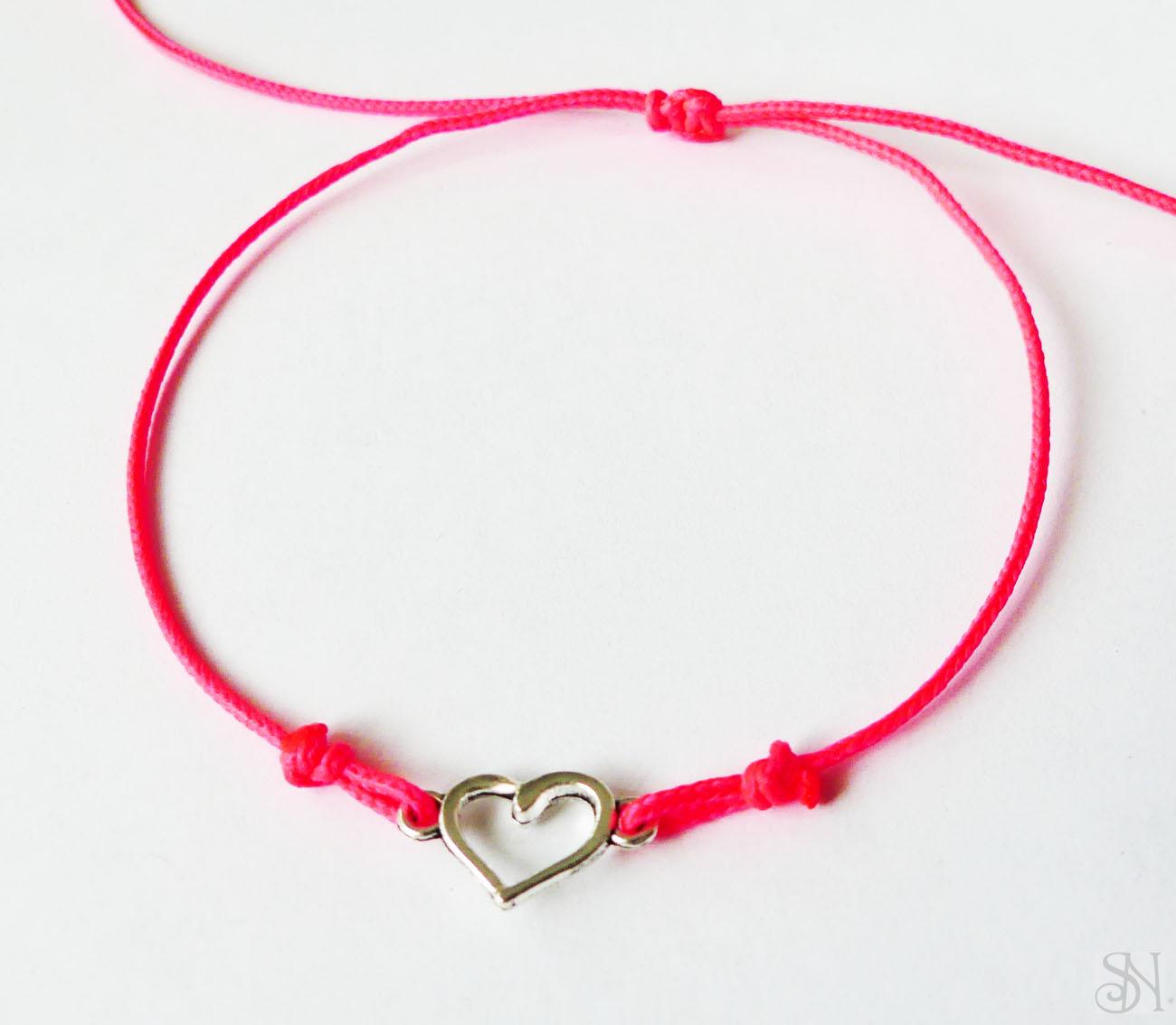 Ružový zaťahovací šnúrkový náramok so srdcom z bižutérneho kovu bez obsahu niklu.