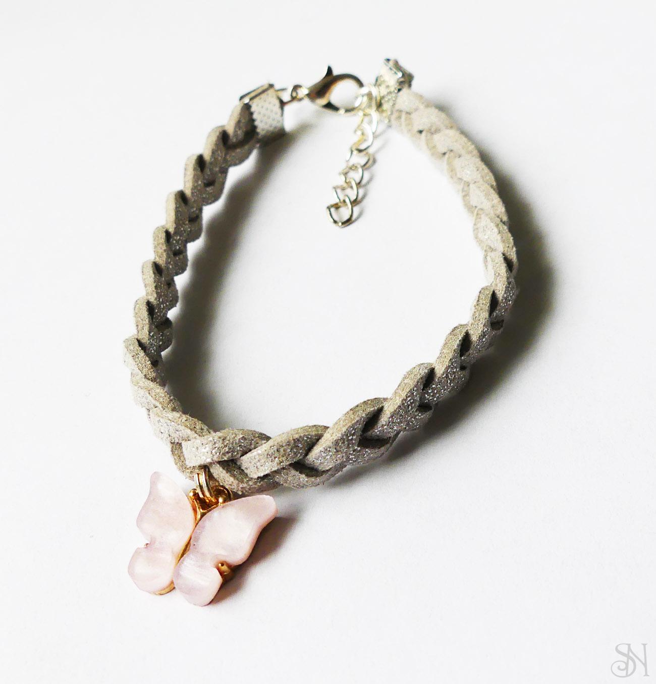 Sivý náramok s príveskom motýľa. Náramok je vyrobený zo semišovej šnúrky. Doplnený je kovovými komponentami bez obsahu niklu.