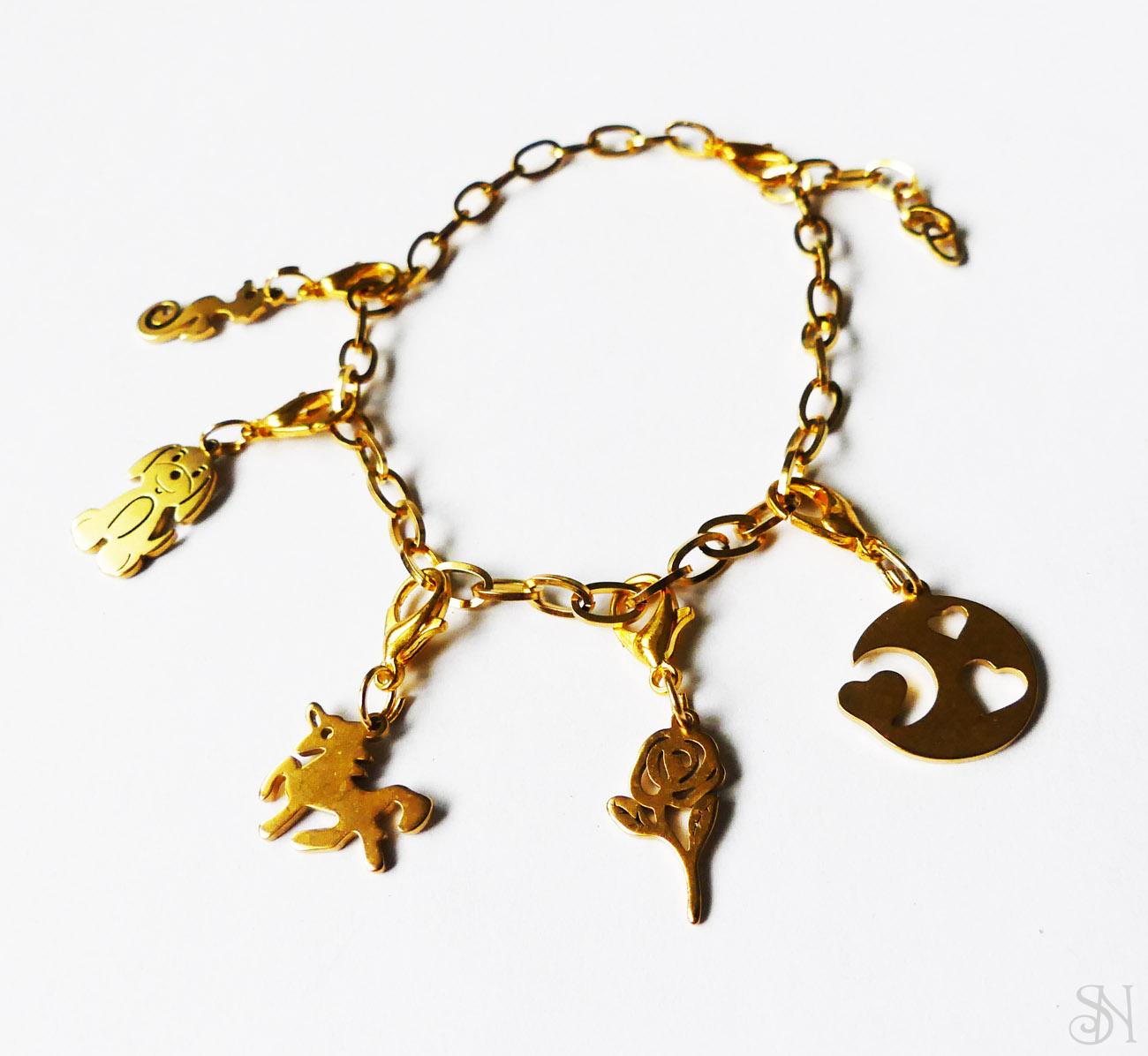 Varia náramok s príveskami vyrobený z kovových komponentov zlatej farby z chirurgickej ocele. Prívesky je možné dokupovať, keďže sa karabínkou zavesia na retiazku. Veľkosť je nastaviteľná