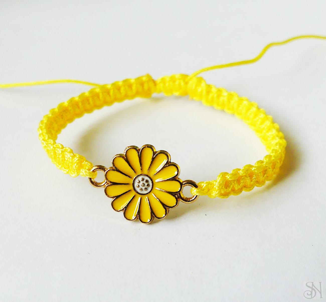 Žltý náramok vyrobený zo šnúrky s korálkou kvetu. Praktické posuvné makramé zapínanie - náramok sa roztiahne a stiahne podľa potreby.