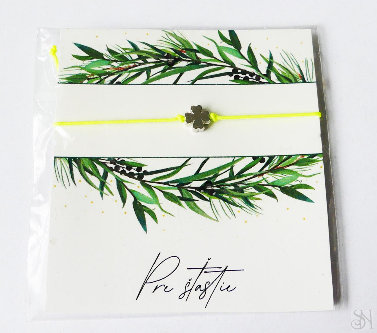 Žltý ručne vyrobený náramok so štvorlístkom na kartičke s textom pre šťastie